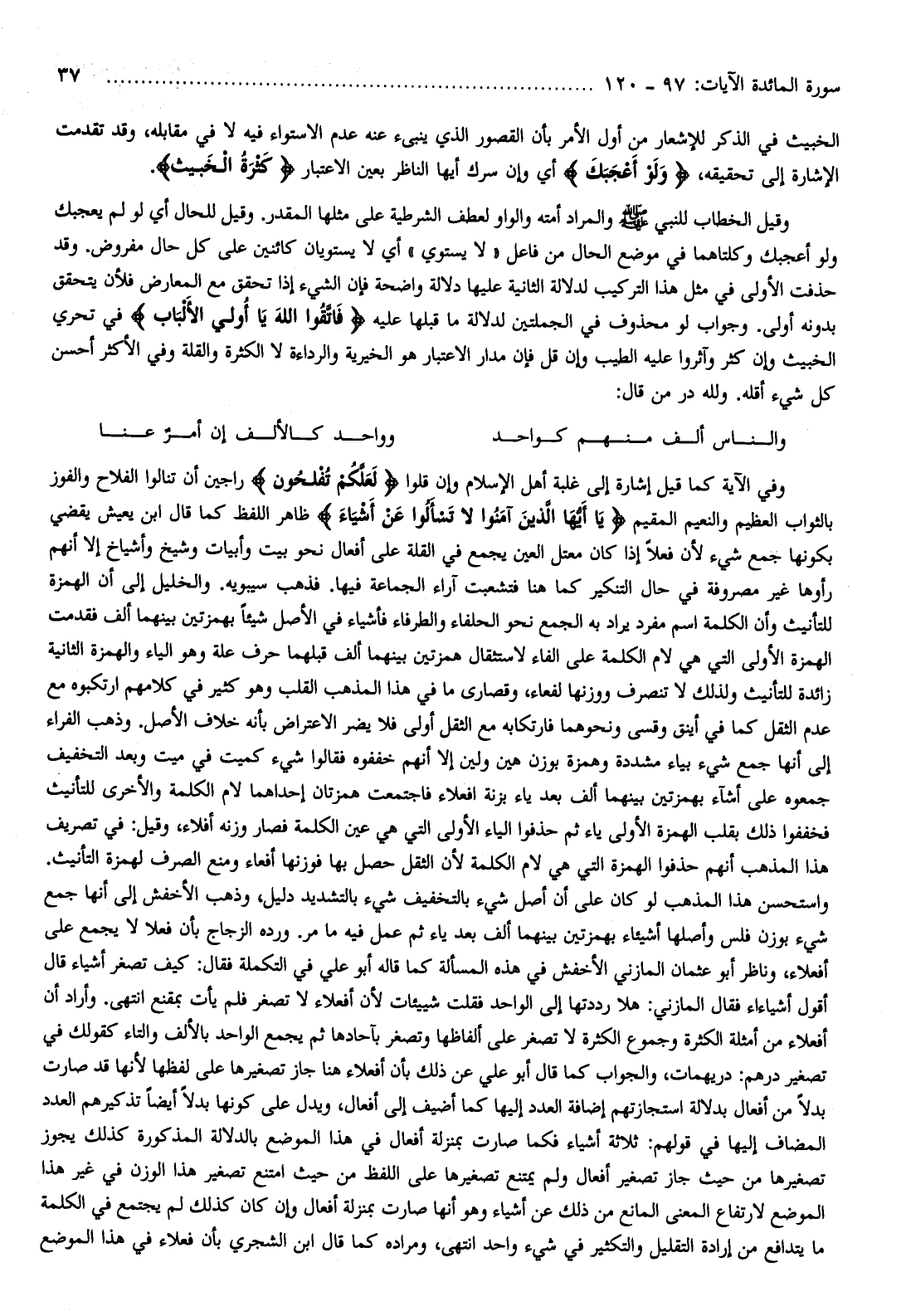 وفي الآية كما قيل إشارة إلى غلبة أهل الإسلام وإن قلوا لَعَلَّكُمْ تُفْلِحُونَ راجين أن تنالوا الفلاح والفوز بالثواب العظيم والنعيم المقيم يا أَيُّهَا الَّذِينَ آمَنُوا لا تَسْئَلُوا عَنْ أَشْياءَ ظاهر اللفظ كما قال ابن يعيش يقضي بكونها جمع شيء لأن فعلا إذا كان معتل العين يجمع في القلة على أفعال نحو بيت وأبيات وشيخ وأشياخ إلا أنهم رأوها غير مصروفة في حال التنكير كما هنا فتشعبت آراء الجماعة فيها. فذهب سيبويه. والخليل إلى أن الهمزة للتأنيث وأن الكلمة اسم مفرد يراد به الجمع نحو الحلفاء والطرفاء فأشياء في الأصل شيئا بهمزتين بينهما ألف فقدمت الهمزة الأولى التي هي لام الكلمة على الفاء لاستثقال همزتين بينهما ألف قبلهما حرف علة وهو الياء والهمزة الثانية زائدة للتأنيث ولذلك لا تنصرف ووزنها لفعاء، وقصارى ما في هذا المذهب القلب وهو كثير في كلامهم ارتكبوه مع عدم الثقل كما في أينق وقسى ونحوهما فارتكابه مع الثقل أولى فلا يضر الاعتراض بأنه خلاف الأصل. وذهب الفراء إلى أنها جمع شيء بياء مشددة وهمزة بوزن هين ولين إلا أنهم خففوه فقالوا شيء كميت في ميت وبعد التخفيف جمعوه على أشآء بهمزتين بينهما ألف بعد ياء بزنة افعلاء فاجتمعت همزتان إحداهما لام الكلمة والأخرى للتأنيث فخففوا ذلك بقلب الهمزة الأولى ياء ثم حذفوا الياء الأولى التي هي عين الكلمة فصار وزنه أفلاء، وقيل: في تصريف هذا المذهب أنهم حذفوا الهمزة التي هي لام الكلمة لأن الثقل حصل بها فوزنها أفعاء ومنع الصرف لهمزة التأنيث.