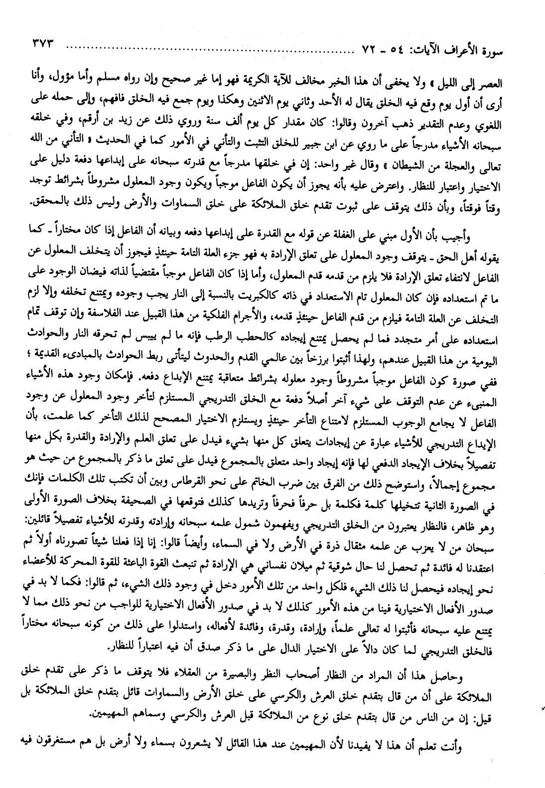 وقال غير واحد: إن في خلقها مدرجا مع قدرته سبحانه على إبداعها دفعة دليل على الاختيار واعتبار للنظار. واعترض عليه بأنه يجوز أن يكون الفاعل موجبا ويكون وجود المعلول مشروطا بشرائط توجد وقتا فوقتا، وبأن ذلك يتوقف على ثبوت تقدم خلق الملائكة على خلق السماوات والأرض وليس ذلك بالمحقق.