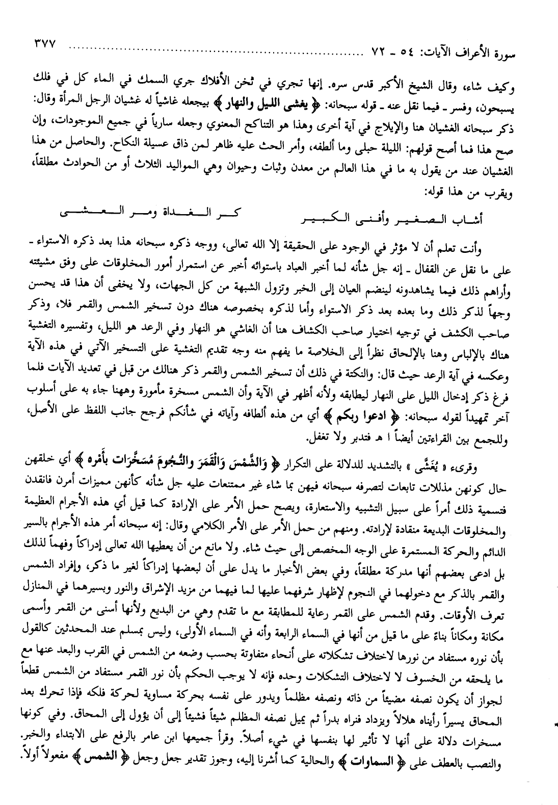 وكيف شاء، وقال الشيخ الأكبر قدس سره. إنها تجري في ثخن الأفلاك جري السمك في الماء كل في فلك يسبحون، وفسر- فيما نقل عنه- قوله سبحانه: يُغْشِي اللَّيْلَ النَّهارَ بيجعله غاشيا له غشيان الرجل المرأة وقال: