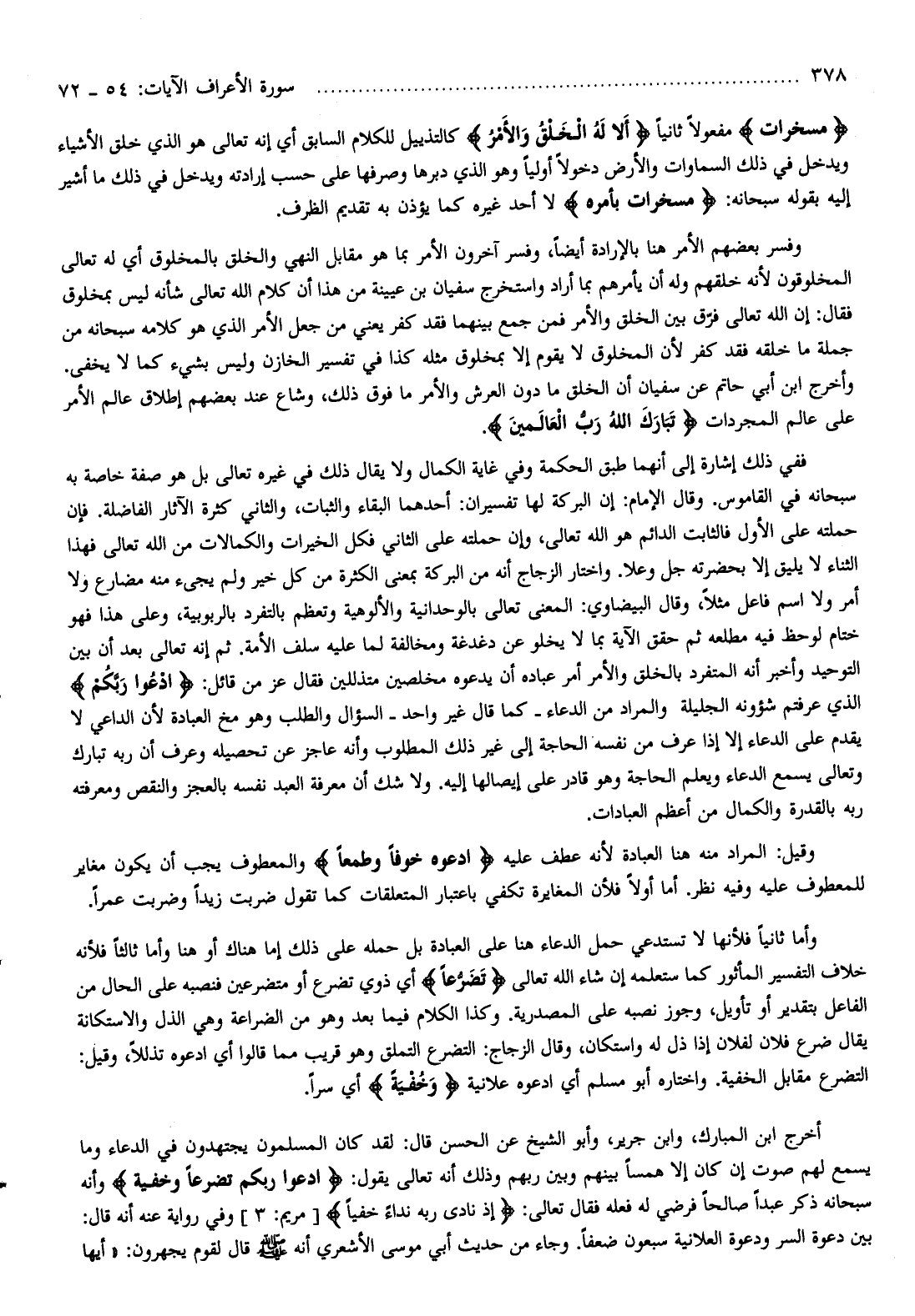 ففي ذلك إشارة إلى أنهما طبق الحكمة وفي غاية الكمال ولا يقال ذلك في غيره تعالى بل هو صفة خاصة به سبحانه في القاموس. وقال الإمام: إن البركة لها تفسيران: أحدهما البقاء والثبات، والثاني كثرة الآثار الفاضلة. فإن حملته على الأول فالثابت الدائم هو الله تعالى، وإن حملته على الثاني فكل الخيرات والكمالات من الله تعالى فهذا الثناء لا يليق إلا بحضرته جل وعلا. واختار الزجاج أنه من البركة بمعنى الكثرة من كل خير ولم يجىء منه مضارع ولا أمر ولا اسم فاعل مثلا، وقال البيضاوي: المعنى تعالى بالوحدانية والألوهية وتعظم بالتفرد بالربوبية، وعلى هذا فهو ختام لوحظ فيه مطلعه ثم حقق الآية بما لا يخلو عن دغدغة ومخالفة لما عليه سلف الأمة. ثم إنه تعالى بعد أن بين التوحيد وأخبر أنه المتفرد بالخلق والأمر أمر عباده أن يدعوه مخلصين متذللين فقال عز من قائل: ادْعُوا رَبَّكُمْ الذي عرفتم شؤونه الجليلة والمراد من الدعاء- كما قال غير واحد- السؤال والطلب وهو مخ العبادة لأن الداعي لا يقدم على الدعاء إلا إذا عرف من نفسه الحاجة إلى غير ذلك المطلوب وأنه عاجز عن تحصيله وعرف أن ربه تبارك وتعالى يسمع الدعاء ويعلم الحاجة وهو قادر على إيصالها إليه. ولا شك أن معرفة العبد نفسه بالعجز والنقص ومعرفته ربه بالقدرة والكمال من أعظم العبادات.