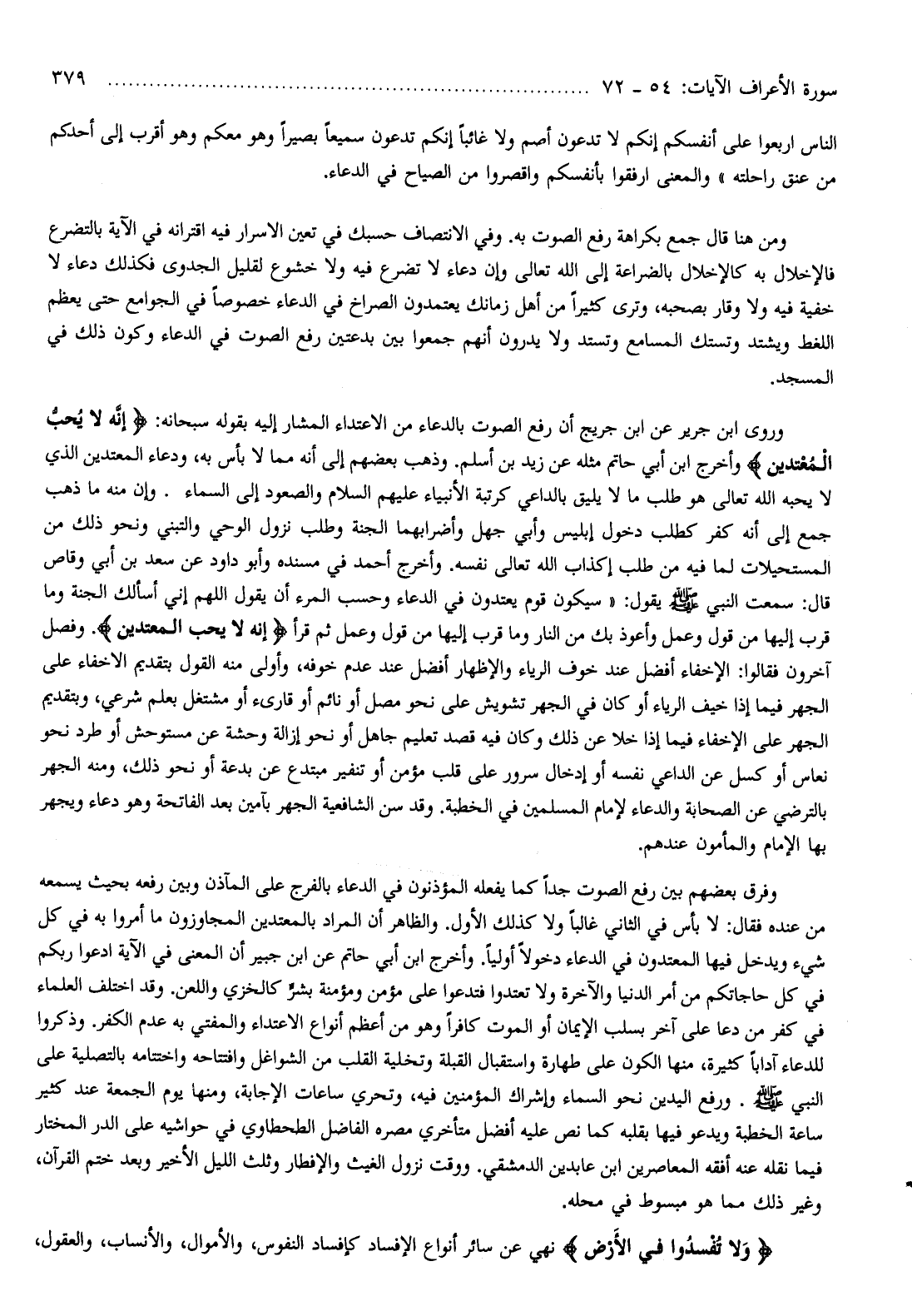 وروى ابن جرير عن ابن جريج أن رفع الصوت بالدعاء من الاعتداء المشار إليه بقوله سبحانه: إِنَّهُ لا يُحِبُّ الْمُعْتَدِينَ وأخرج ابن أبي حاتم مثله عن زيد بن أسلم. وذهب بعضهم إلى أنه مما لا بأس به، ودعاء المعتدين الذي لا يحبه الله تعالى هو طلب ما لا يليق بالداعي كرتبة الأنبياء عليهم السلام والصعود إلى السماء. وإن منه ما ذهب جمع إلى أنه كفر كطلب دخول إبليس وأبي جهل وأضرابهما الجنة وطلب نزول الوحي والتبني ونحو ذلك من المستحيلات لما فيه من طلب إكذاب الله تعالى نفسه.