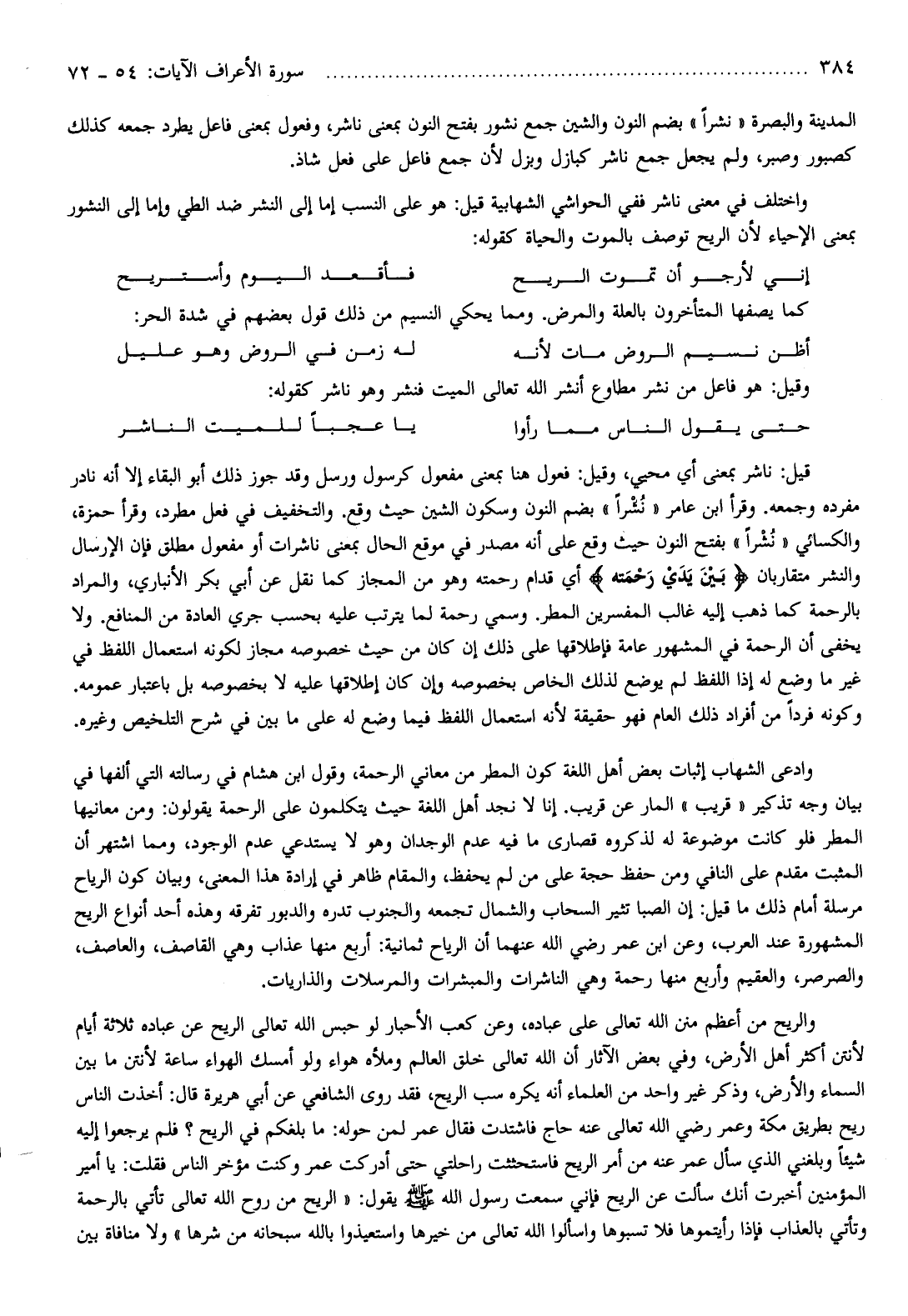 وادعى الشهاب إثبات بعض أهل اللغة كون المطر من معاني الرحمة، وقول ابن هشام في رسالته التي ألفها في بيان وجه تذكير «قريب» المار عن قريب. إنا لا نجد أهل اللغة حيث يتكلمون على الرحمة يقولون: ومن معانيها المطر فلو كانت موضوعة له لذكروه قصارى ما فيه عدم الوجدان وهو لا يستدعي عدم الوجود، ومما اشتهر أن المثبت مقدم على النافي ومن حفظ حجة على من لم يحفظ، والمقام ظاهر في إرادة هذا المعنى، وبيان كون الرياح مرسلة أمام ذلك ما قيل: إن الصبا تثير السحاب والشمال تجمعه والجنوب تدره والدبور تفرقه وهذه أحد أنواع الريح المشهورة عند العرب، وعن ابن عمر رضي الله عنهما أن الرياح ثمانية: أربع منها عذاب وهي القاصف، والعاصف، والصرصر، والعقيم وأربع منها رحمة وهي الناشرات والمبشرات والمرسلات والذاريات.