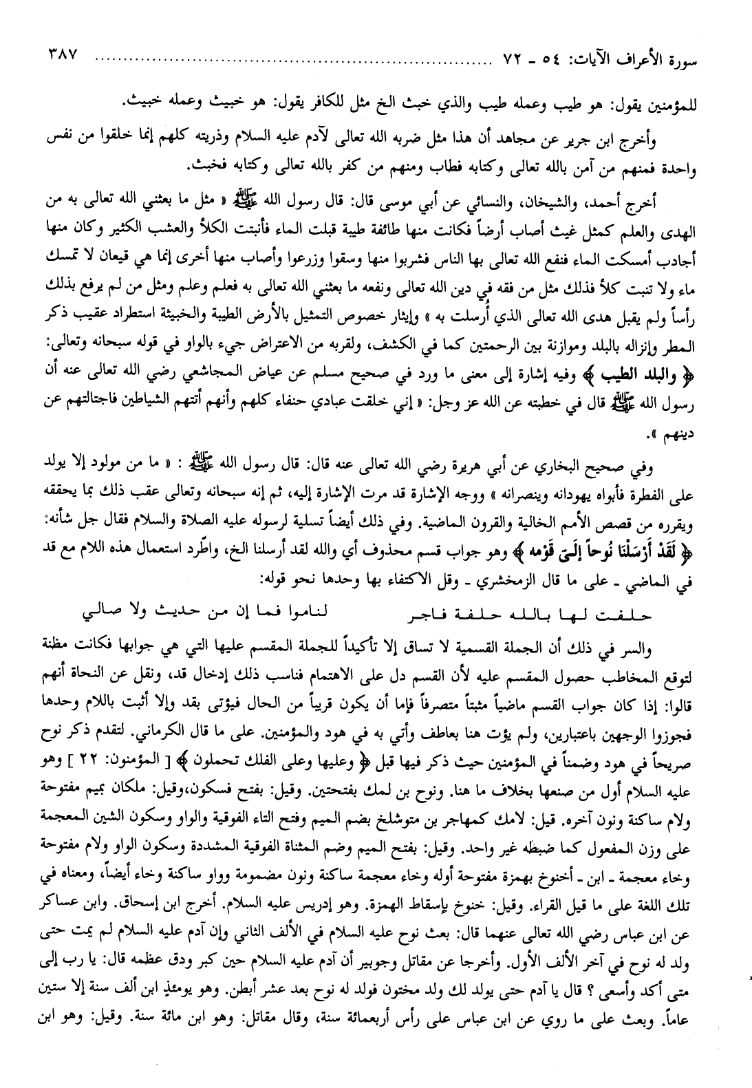 أخرج أحمد، والشيخان، والنسائي عن أبي موسى قال: قال رسول الله صلّى الله عليه وسلّم «مثل ما بعثني الله تعالى به من الهدى والعلم كمثل غيث أصاب أرضا فكانت منها طائفة طيبة قبلت الماء فأنبتت الكلأ والعشب الكثير وكان منها أجادب أمسكت الماء فنفع الله تعالى بها الناس فشربوا منها وسقوا وزرعوا وأصاب منها أخرى إنما هي قيعان لا تمسك ماء ولا تنبت كلأ فذلك مثل من فقه في دين الله تعالى ونفعه ما بعثني الله تعالى به فعلم وعلم ومثل من لم يرفع بذلك رأسا ولم يقبل هدى الله تعالى الذي أرسلت به»