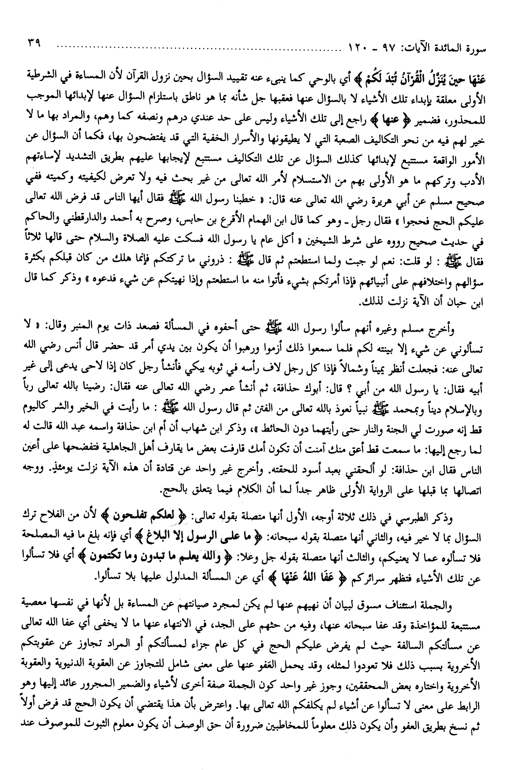 وذكر الطبرسي في ذلك ثلاثة أوجه، الأول أنها متصلة بقوله تعالى: لَعَلَّكُمْ تُفْلِحُونَ لأن من الفلاح ترك السؤال بما لا خير فيه، والثاني أنها متصلة بقوله سبحانه: ما عَلَى الرَّسُولِ إِلَّا الْبَلاغُ أي فإنه بلغ ما فيه المصلحة فلا تسألوه عما لا يعنيكم، والثالث أنها متصلة بقوله جل وعلا: وَاللَّهُ يَعْلَمُ ما تُبْدُونَ وَما تَكْتُمُونَ أي فلا تسألوا عن تلك الأشياء فتظهر سرائركم عَفَا اللَّهُ عَنْها أي عن المسألة المدلول عليها بلا تسألوا.