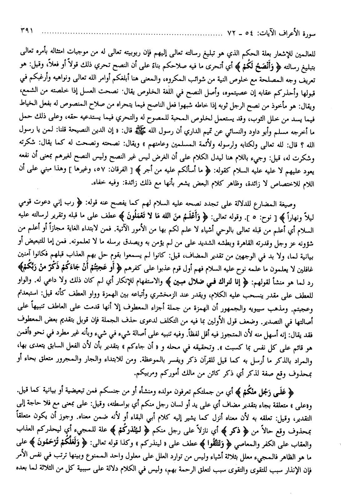 للعالمين للإشعار بعلة الحكم الذي هو تبليغ رسالته تعالى إليهم فإن ربوبيته تعالى له من موجبات امتثاله بأمره تعالى بتبليغ رسالته وَأَنْصَحُ لَكُمْ أي أتحرى ما فيه صلاحكم بناء على أن النصح تحري ذلك قولا أو فعلا، وقيل: هو تعريف وجه المصلحة مع خلوص النية من شوائب المكروه، والمعنى هنا أبلغكم أوامر الله تعالى ونواهيه وأرغبكم في قبولها وأحذركم عقابه إن عصيتموه، وأصل النصح في اللغة الخلوص يقال: نصحت العسل إذا خلصته من الشمع، ويقال: هو مأخوذ من نصح الرجل ثوبه إذا خاطه شبهوا فعل الناصح فيما يتحراه من صلاح المنصوص له بفعل الخياط فيما يسد من خلل الثوب، وقد يستعمل لخلوص المحبة للمصوح له والتحري فيما يستدعيه حقه، وعلى ذلك حمل ما