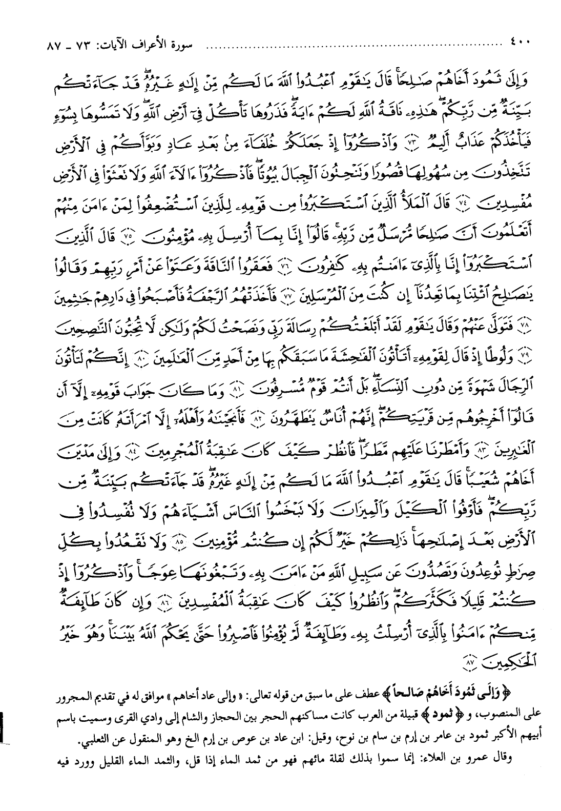 وَإِلى ثَمُودَ أَخاهُمْ صالِحاً عطف على ما سبق من قوله تعالى: «وإلى عاد أخاهم» موافق له في تقديم المجرور على المنصوب، وثَمُودَ قبيلة من العرب كانت مساكنهم الحجر بين الحجاز والشام إلى وادي القرى وسميت باسم أبيهم الأكبر ثمود بن عامر بن إرم بن سام بن نوح، وقيل: ابن عاد بن عوص بن إرم إلخ وهو المنقول عن الثعلبي.