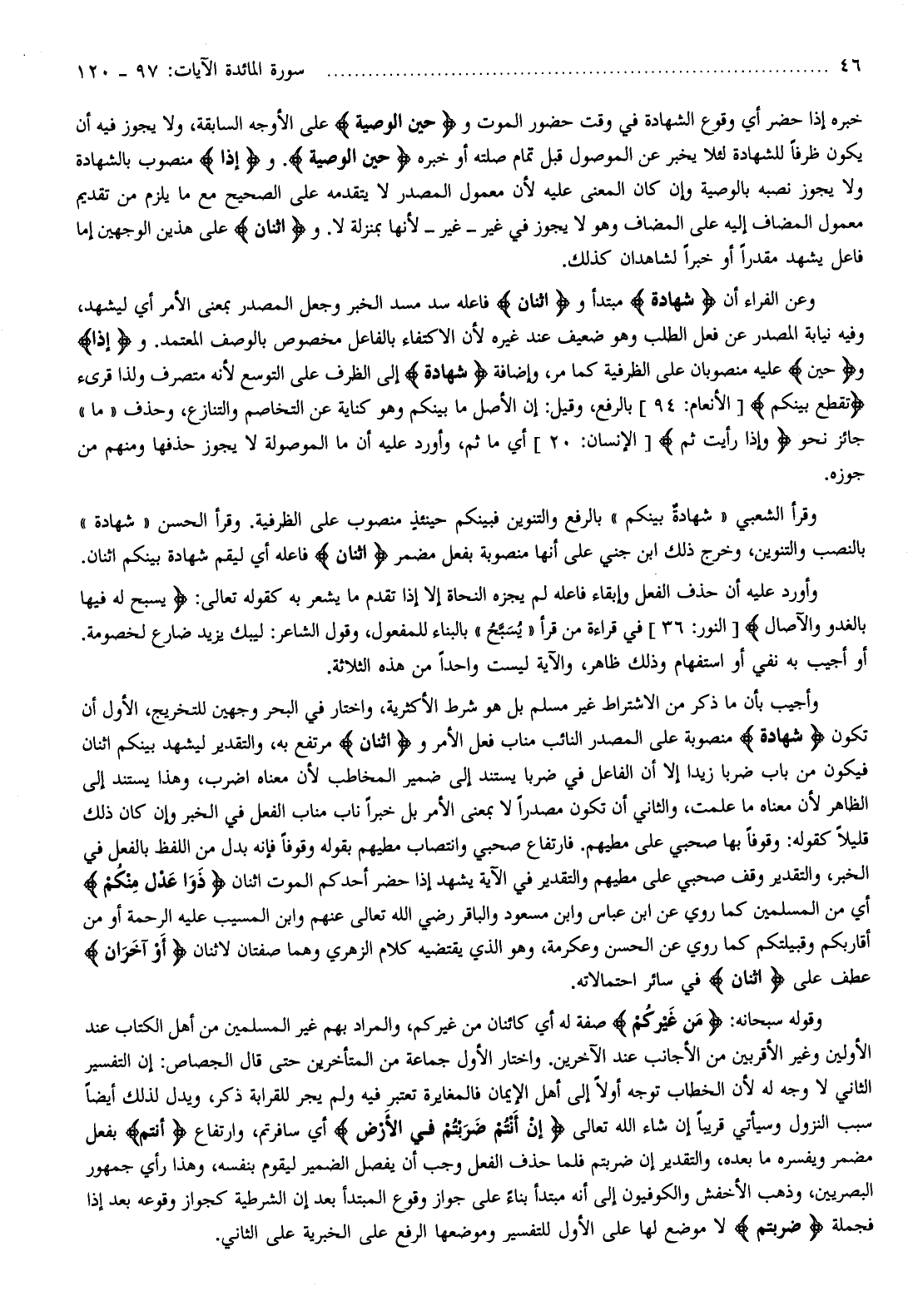 وأجيب بأن ما ذكر من الاشتراط غير مسلم بل هو شرط الأكثرية، واختار في البحر وجهين للتخريج، الأول أن تكون شَهادَةُ منصوبة على المصدر النائب مناب فعل الأمر واثْنانِ مرتفع به، والتقدير ليشهد بينكم اثنان فيكون من باب ضربا زيدا إلا أن الفاعل في ضربا يستند إلى ضمير المخاطب لأن معناه اضرب، وهذا يستند إلى الظاهر لأن معناه ما علمت، والثاني أن تكون مصدرا لا بمعنى الأمر بل خبرا ناب مناب الفعل في الخبر وإن كان ذلك قليلا كقوله: وقوفا بها صحبي على مطيهم. فارتفاع صحبي وانتصاب مطيهم بقوله وقوفا فإنه بدل من اللفظ بالفعل في الخبر، والتقدير وقف صحبي على مطيهم والتقدير في الآية يشهد إذا حضر أحدكم الموت اثنان ذَوا عَدْلٍ مِنْكُمْ أي