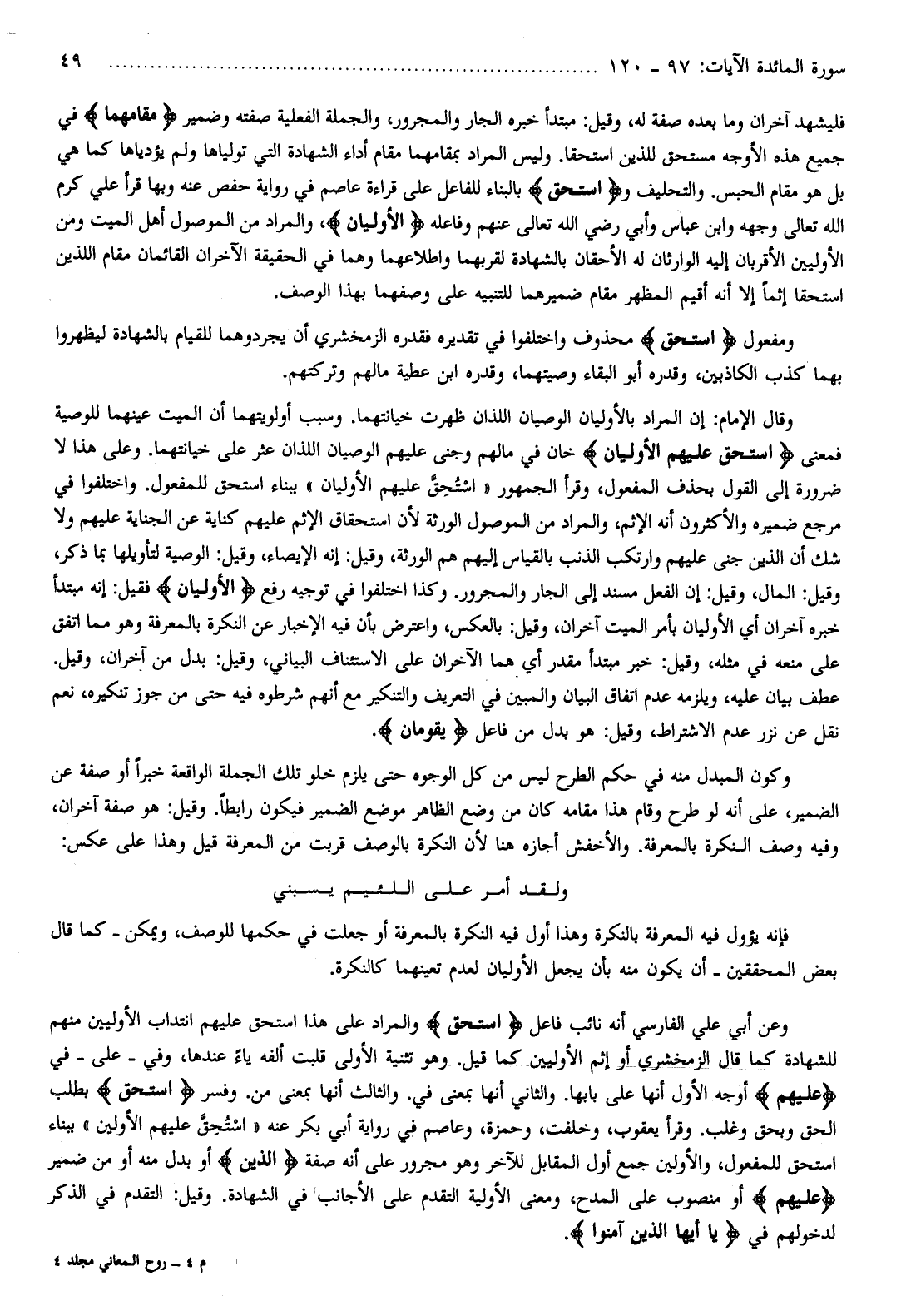 وقال الإمام: إن المراد بالأوليان الوصيان اللذان ظهرت خيانتهما. وسبب أولويتهما أن الميت عينهما للوصية فمعنى اسْتَحَقَّ عَلَيْهِمُ الْأَوْلَيانِ خان في مالهم وجنى عليهم الوصيان اللذان عثر على خيانتهما. وعلى هذا لا ضرورة إلى القول بحذف المفعول، وقرأ الجمهور «استحقّ عليهم الأوليان» ببناء استحق للمفعول. واختلفوا في مرجع ضميره والأكثرون أنه الإثم، والمراد من الموصول الورثة لأن استحقاق الإثم عليهم كناية عن الجناية عليهم ولا شك أن الذين جنى عليهم وارتكب الذنب بالقياس إليهم هم الورثة، وقيل: إنه الإيصاء، وقيل: الوصية لتأويلها بما ذكر، وقيل: المال، وقيل: إن الفعل مسند إلى الجار والمجرور. وكذا اختلفوا في توجيه رفع الْأَوْلَيانِ فقيل: إنه مبتدأ خبره آخران أي الأوليان بأمر الميت آخران، وقيل: بالعكس، واعترض بأن فيه الإخبار عن النكرة بالمعرفة وهو مما اتفق على منعه في مثله، وقيل: خبر مبتدأ مقدر أي هما الآخران على الاستئناف البياني، وقيل: بدل من آخران، وقيل.