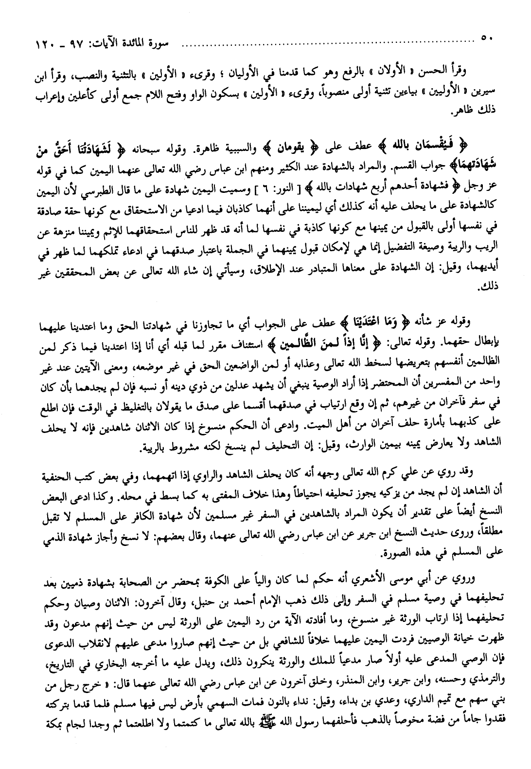 وروي عن أبي موسى الأشعري أنه حكم لما كان واليا على الكوفة بمحضر من الصحابة بشهادة ذميين بعد تحليفهما في وصية مسلم في السفر وإلى ذلك ذهب الإمام أحمد بن حنبل، وقال آخرون: الاثنان وصيان وحكم تحليفهما إذا ارتاب الورثة غير منسوخ، وما أفادته الآية من رد اليمين على الورثة ليس من حيث إنهم مدعون وقد ظهرت خيانة الوصيين فردت اليمين عليهما خلافا للشافعي بل من حيث إنهم صاروا مدعى عليهم لانقلاب الدعوى فإن الوصي المدعى عليه أولا صار مدعيا للملك والورثة ينكرون ذلك، ويدل عليه ما