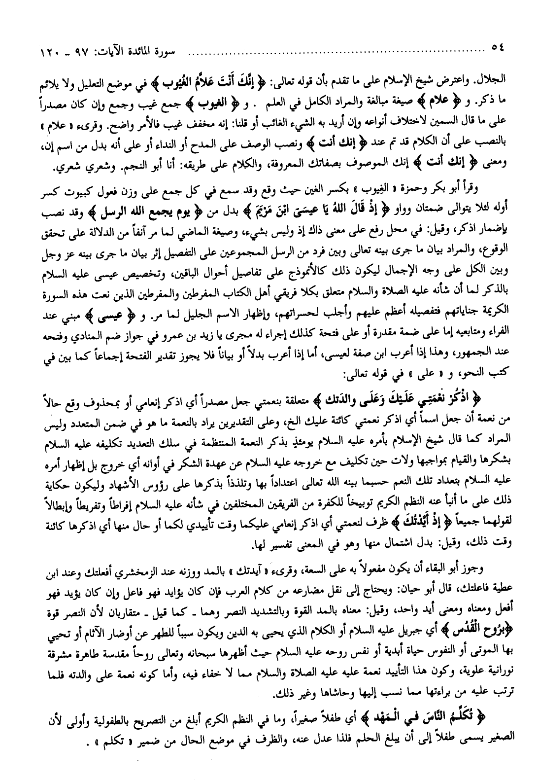 وقرأ أبو بكر وحمزة «الغيوب» بكسر الغين حيث وقع وقد سمع في كل جمع على وزن فعول كبيوت كسر أوله لئلا يتوالى ضمتان وواو إِذْ قالَ اللَّهُ يا عِيسَى ابْنَ مَرْيَمَ بدل من يَوْمَ يَجْمَعُ اللَّهُ الرُّسُلَ وقد نصب بإضمار اذكر، وقيل: في محل رفع على معنى ذاك إذ وليس بشيء، وصيغة الماضي لما مر آنفا من الدلالة على تحقق الوقوع، والمراد بيان ما جرى بينه تعالى وبين فرد من الرسل المجموعين على التفصيل إثر بيان ما جرى بينه عز وجل وبين الكل على وجه الإجمال ليكون ذلك كالأنموذج على تفاصيل أحوال الباقين، وتخصيص عيسى عليه السلام بالذكر لما أن شأنه عليه الصلاة والسلام متعلق بكلا فريقي أهل الكتاب المفرطين والمفرطين الذين نعت هذه السورة الكريمة جناياتهم فتصيله أعظم عليهم وأجلب لحسراتهم، وإظهار الاسم الجليل لما مر. وعِيسَى مبني عند الفراء ومتابعيه إما على ضمة مقدرة أو على فتحة كذلك إجراء له مجرى يا زيد بن عمرو في جواز ضم المنادي وفتحه عند الجمهور، وهذا إذا أعرب ابن صفة لعيسى، أما إذا أعرب بدلا أو بيانا فلا يجوز تقدير الفتحة إجماعا كما بين في كتب النحو، و «على» في قوله تعالى: