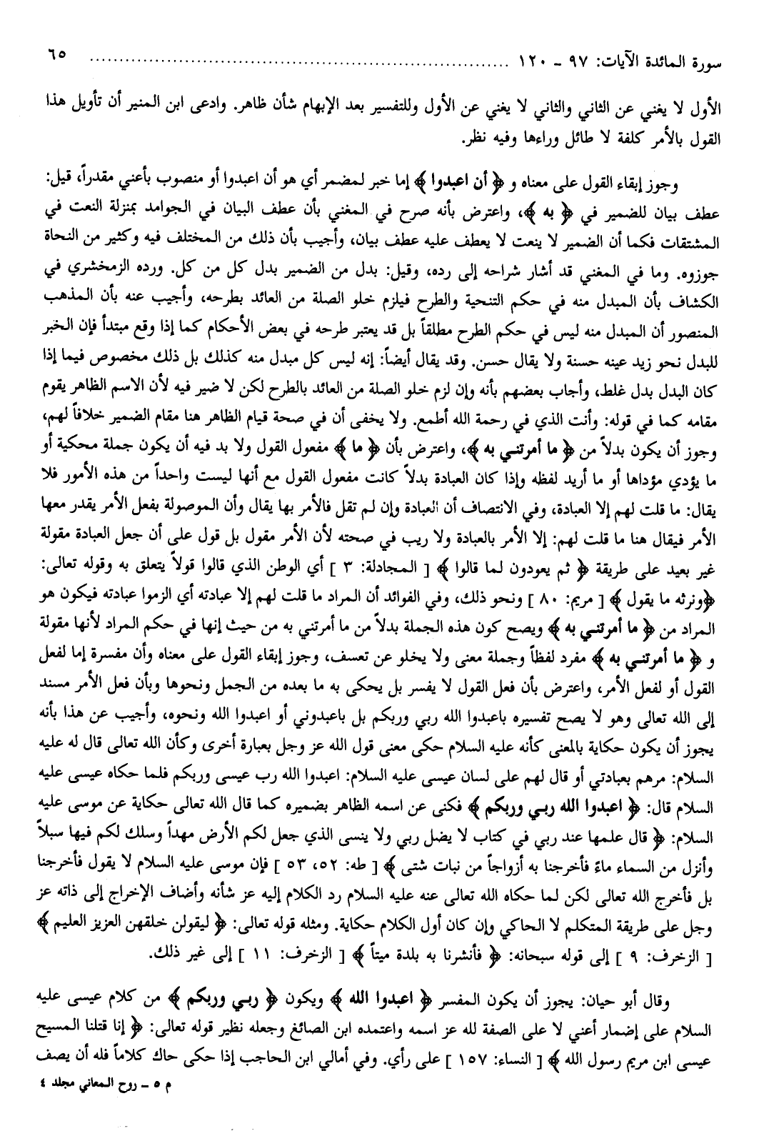 وقال أبو حيان: يجوز أن يكون المفسر اعْبُدُوا اللَّهَ ويكون رَبِّي وَرَبَّكُمْ من كلام عيسى عليه السلام على إضمار أعني لا على الصفة لله عز اسمه واعتمده ابن الصائغ وجعله نظير قوله تعالى: إِنَّا قَتَلْنَا الْمَسِيحَ عِيسَى ابْنَ مَرْيَمَ رَسُولَ اللَّهِ [النساء: 157] على رأي. وفي أمالي ابن الحاجب إذا حكى حاك كلاما فله أن يصف م 5- روح المعاني مجلد 4