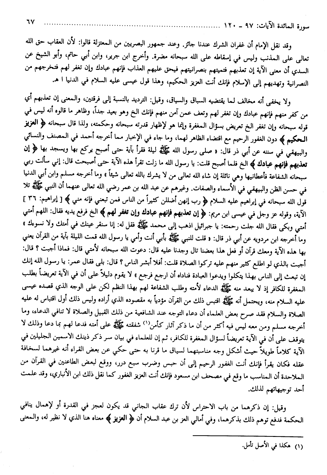 وقد نقل الإمام أن غفران الشرك عندنا جائز. وعند جمهور البصريين من المعتزلة قالوا: لأن العقاب حق الله تعالى على المذنب وليس في إسقاطه على الله سبحانه مضرة. وأخرج ابن جرير، وابن أبي حاتم، وأبو الشيخ عن السدي أن معنى الآية إن تعذبهم فتميتهم بنصرانيتهم فيحق عليهم العذاب فإنهم عبادك وإن تغفر لهم فتخرجهم من النصرانية وتهديهم إلى الإسلام فإنك أنت العزيز الحكيم، وهذا قول عيسى عليه السلام في الدنيا اه.