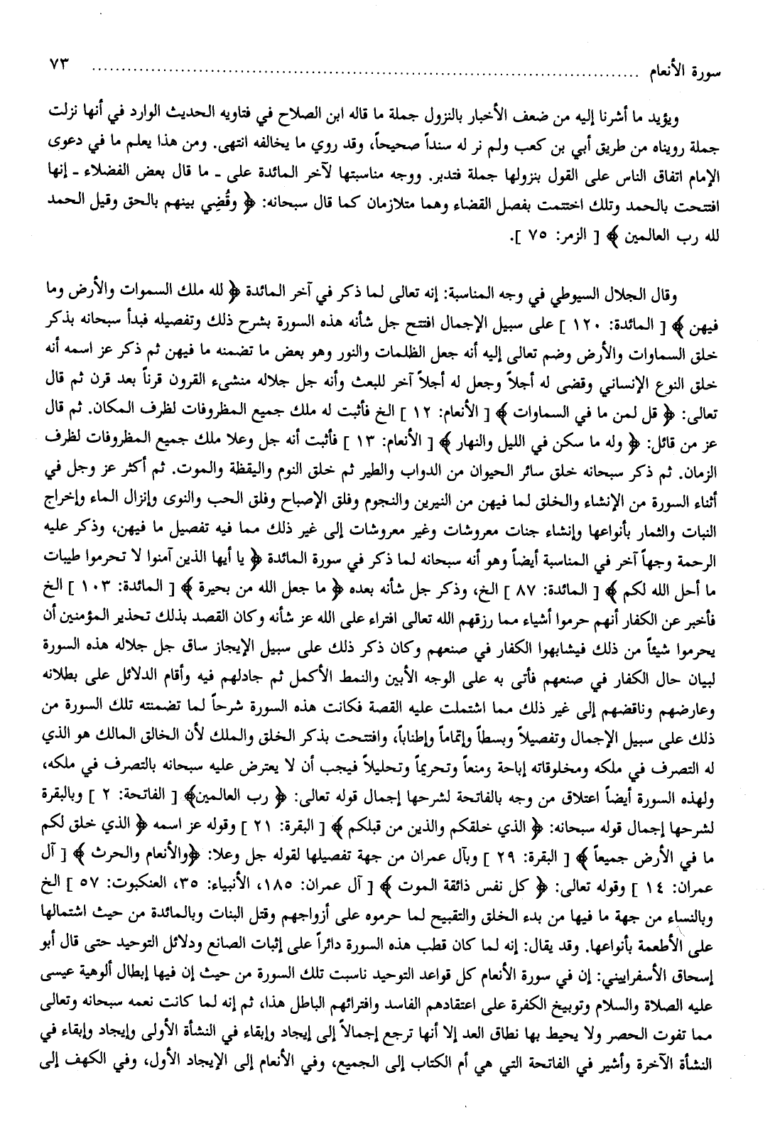 وقال الجلال السيوطي في وجه المناسبة: إنه تعالى لما ذكر في آخر المائدة لِلَّهِ مُلْكُ السَّماواتِ وَالْأَرْضِ وَما فِيهِنَّ [المائدة: 120] على سبيل الإجمال افتتح جل شأنه هذه السورة بشرح ذلك وتفصيله فبدأ سبحانه بذكر خلق السماوات والأرض وضم تعالى إليه أنه جعل الظلمات والنور وهو بعض ما تضمنه ما فيهن ثم ذكر عز اسمه أنه خلق النوع الإنساني وقضى له أجلا وجعل له أجلا آخر للبعث وأنه جل جلاله منشىء القرون قرنا بعد قرن ثم قال تعالى: قُلْ لِمَنْ ما فِي السَّماواتِ [الأنعام: 12] إلخ فأثبت له ملك جميع المظروفات لظرف المكان. ثم قال عز من قائل: وَلَهُ ما سَكَنَ فِي اللَّيْلِ وَالنَّهارِ [الأنعام: 13] فأثبت أنه جل وعلا ملك جميع المظروفات لظرف الزمان. ثم ذكر سبحانه خلق سائر الحيوان من الدواب والطير ثم خلق النوم واليقظة والموت. ثم أكثر عز وجل في أثناء السورة من الإنشاء والخلق لما فيهن من النيرين والنجوم وفلق الإصباح وفلق الحب والنوى وإنزال الماء وإخراج النبات والثمار بأنواعها وإنشاء جنات معروشات وغير معروشات إلى غير ذلك مما فيه تفصيل ما فيهن، وذكر عليه الرحمة وجها آخر في المناسبة أيضا وهو أنه سبحانه لما ذكر في سورة المائدة يا أَيُّهَا الَّذِينَ آمَنُوا لا تُحَرِّمُوا طَيِّباتِ ما أَحَلَّ اللَّهُ لَكُمْ [المائدة: 87] إلخ، وذكر جل شأنه بعده ما جَعَلَ اللَّهُ مِنْ بَحِيرَةٍ [المائدة: 103] إلخ فأخبر عن الكفار أنهم حرموا أشياء مما رزقهم الله تعالى افتراء على الله عز شأنه وكان القصد بذلك تحذير المؤمنين أن يحرموا شيئا من ذلك فيشابهوا الكفار في صنعهم وكان ذكر ذلك على سبيل الإيجاز ساق جل جلاله هذه السورة لبيان حال الكفار في صنعهم فأتى به على الوجه الأبين والنمط الأكمل ثم جادلهم فيه وأقام الدلائل على بطلانه وعارضهم وناقضهم إلى غير ذلك مما اشتملت عليه القصة فكانت هذه السورة شرحا لما تضمنته تلك السورة من ذلك على سبيل الإجمال وتفصيلا وبسطا وإتماما وإطنابا، وافتتحت بذكر الخلق والملك لأن الخالق المالك هو الذي له التصرف في ملكه ومخلوقاته إباحة ومنعا وتحريما وتحليلا فيجب أن لا يعترض عليه سبحانه بالتصرف في ملكه، ولهذه السورة أيضا اعتلاق من وجه بالفاتحة لشرحها إجمال قوله تعالى: رَبِّ الْعالَمِينَ [الفاتحة: 2] وبالبقرة لشرحها إجمال قوله سبحانه: الَّذِي خَلَقَكُمْ وَالَّذِينَ مِنْ قَبْلِكُمْ [البقرة: 21] وقوله عز اسمه الَّذِي خَلَقَ لَكُمْ ما فِي الْأَرْضِ جَمِيعاً [البقرة: 29] وبآل عمران من جهة تفصيلها لقوله جل وعلا: وَالْأَنْعامِ وَالْحَرْثِ [آل عمران: 14] وقوله تعالى: كُلُّ نَفْسٍ ذائِقَةُ الْمَوْتِ [آل عمران: 185، الأنبياء: 35، العنكبوت: 57] إلخ وبالنساء من جهة ما فيها من بدء الخلق والتقبيح لما حرموه على أزواجهم وقتل البنات وبالمائدة من حيث اشتمالها على الأطعمة بأنواعها. وقد يقال: إنه لما كان قطب هذه السورة دائرا على إثبات الصانع ودلائل التوحيد حتى قال أبو إسحاق الأسفراييني: إن في سورة الأنعام كل قواعد التوحيد ناسبت تلك السورة من حيث إن فيها إبطال ألوهية عيسى عليه الصلاة والسلام وتوبيخ الكفرة على اعتقادهم الفاسد وافترائهم الباطل هذا، ثم إنه لما كانت نعمه سبحانه وتعالى مما تفوت الحصر ولا يحيط بها نطاق العد إلا أنها ترجع إجمالا إلى إيجاد وإبقاء في النشأة الأولى وإيجاد وإبقاء في النشأة الآخرة وأشير في الفاتحة التي هي أم الكتاب إلى الجميع، وفي الأنعام إلى الإيجاد الأول، وفي الكهف إلى