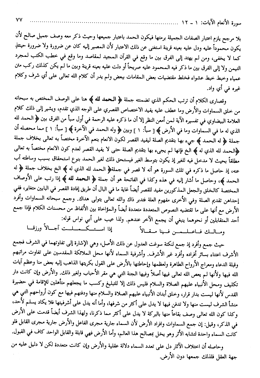بلا مرجح يلزم اعتبار الصفات الجميلة برمتها فيكون الحمد باعتبار جميعها وحيث ذكر معه وصف جميل صالح لأن يكون محمودا عليه ودل عليه بعينه قرينة استغنى عن ذلك الاعتبار لأن المصير إليه كان عن ضرورة ولا ضرورة حينئذ كما لا يخفى، ومن لم يهتد إلى الفرق بين ما وقع في القرآن المجيد لمقاصد وما وقع في خطب الكتب لمجرد التيمن ولا إلى الفرق بين ما ذكر فيه المحمود عليه صريحا أو دلت عليه بعينه قرينة وبين ما لم يكن كذلك ركب متن عمياء وخبط خبط عشواء فخلط مقتضيات بعض المقامات ببعض ولم يدر أن كلام الله تعالى على أي شرف وكلام غيره في أي واد.