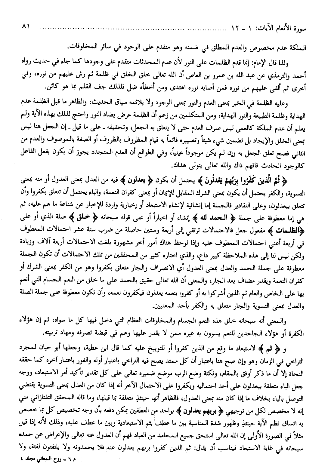 ثُمَّ الَّذِينَ كَفَرُوا بِرَبِّهِمْ يَعْدِلُونَ يحتمل أن يكون يَعْدِلُونَ فيه من العدل بمعنى العدول أو منه بمعنى التسوية، والكفر يحتمل أن يكون بمعنى الشرك المقابل للإيمان أو بمعنى كفران النعمة، والباء يحتمل أن تتعلق بكفروا وأن تتعلق بيعدلون، وعلى التقادير فالجملة إما إنشائية لإنشاء الاستبعاد أو إخبارية واردة للإخبار عن شناعة ما هم عليه، ثم هي إما معطوفة على جملة الْحَمْدُ لِلَّهِ إنشاء أو اخبارا أو على قوله سبحانه خَلَقَ صلة الذي أو على الظُّلُماتِ مفعول جعل فالاحتمالات ترتقي إلى أربعة وستين حاصلة من ضرب ستة عشر احتمالات المعطوف في أربعة أعني احتمالات المعطوف عليه وإذا لوحظ هناك أمور أخر مشهورة بلغت الاحتمالات أربعة آلاف وزيادة ولكن ليس لنا إلى هذه الملاحظة كبير داع، والذي اختاره كثير من المحققين من تلك الاحتمالات أن تكون الجملة معطوفة على جملة الحمد والعدل بمعنى العدول أي الانصراف والجار متعلق بكفروا وهو من الكفر بمعنى الشرك أو كفران النعمة ويقدر مضاف بعد الجار، والمعنى أن الله تعالى حقيق بالحمد على ما خلق من النعم الجسام التي أنعم بها على الخاص والعام ثم الذين أشركوا به أو كفروا بنعمه يعدلون فيكفرون نعمه، وأن تكون معطوفة على جملة الصلة والعدل بمعنى التسوية والجار متعلق به والكفر بأحد المعنيين.
