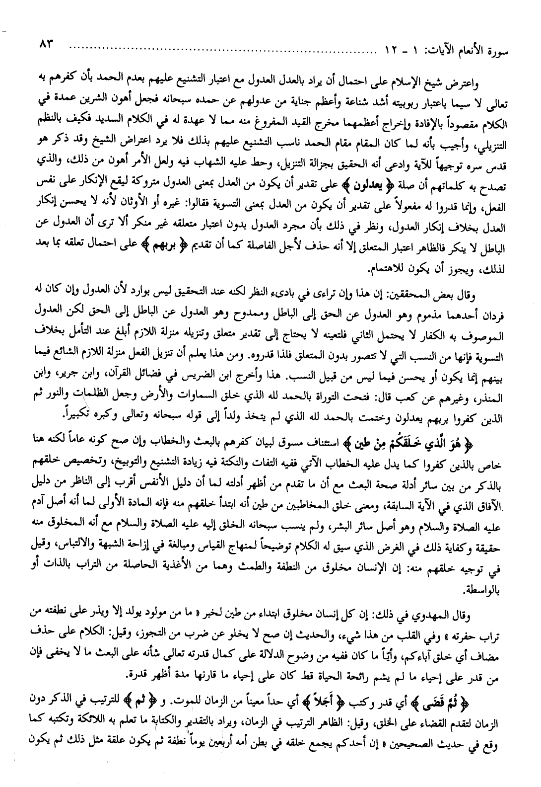واعترض شيخ الإسلام على احتمال أن يراد بالعدل العدول مع اعتبار التشنيع عليهم بعدم الحمد بأن كفرهم به تعالى لا سيما باعتبار ربوبيته أشد شناعة وأعظم جناية من عدولهم عن حمده سبحانه فجعل أهون الشرين عمدة في الكلام مقصودا بالإفادة وإخراج أعظمهما مخرج القيد المفروغ منه مما لا عهدة له في الكلام السديد فكيف بالنظم التنزيلي، وأجيب بأنه لما كان المقام مقام الحمد ناسب التشنيع عليهم بذلك فلا يرد اعتراض الشيخ وقد ذكر هو قدس سره توجيها للآية وادعى أنه الحقيق بجزالة التنزيل، وحط عليه الشهاب فيه ولعل الأمر أهون من ذلك، والذي تصدح به كلماتهم أن صلة يَعْدِلُونَ على تقدير أن يكون من العدل بمعنى العدول متروكة ليقع الإنكار على نفس الفعل، وإنما قدروا له مفعولا على تقدير أن يكون من العدل بمعنى التسوية فقالوا: غيره أو الأوثان لأنه لا يحسن إنكار العدل بخلاف إنكار العدول، ونظر في ذلك بأن مجرد العدول بدون اعتبار متعلقه غير منكر ألا ترى أن العدول عن الباطل لا ينكر فالظاهر اعتبار المتعلق إلا أنه حذف لأجل الفاصلة كما أن تقديم بِرَبِّهِمْ على احتمال تعلقه بما بعد لذلك، ويجوز أن يكون للاهتمام.