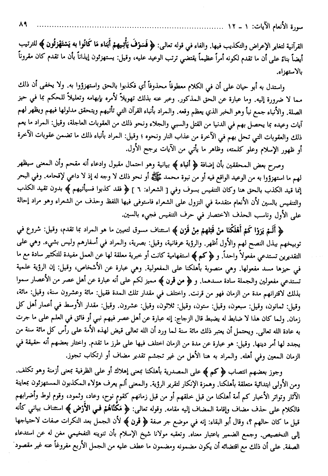 ومن الأولى ابتدائية متعلقة بأهلكنا. وهمزة الإنكار لتقرير الرؤية. والمعنى ألم يعرف هؤلاء المكذبون المستهزءون بمعاينة الآثار وتواتر الأخبار كم أمة أهلكنا من قبل خلقهم أو من قبل زمانهم كقوم نوح، وعاد، وثمود، وقوم لوط وأضرابهم فالكلام على حذف مضاف وإقامة المضاف إليه مقامه. وقوله تعالى: مَكَّنَّاهُمْ فِي الْأَرْضِ استئناف بياني كأنه قيل ما كان حالهم؟، وقال أبو البقاء: إنه في موضع جر صفة قَرْنٍ لأن الجمل بعد النكرات صفات لاحتياجها إلى التخصيص. وجمع الضمير باعتبار معناه. وتعقبه مولانا شيخ الإسلام بأن تنوينه التفخيمي مغن له عن استدعاء الصفة. على أن ذلك مع اقتضائه أن يكون مضمونه ومضمون ما عطف عليه من الجمل الأربع مفروغا عنه غير مقصود
