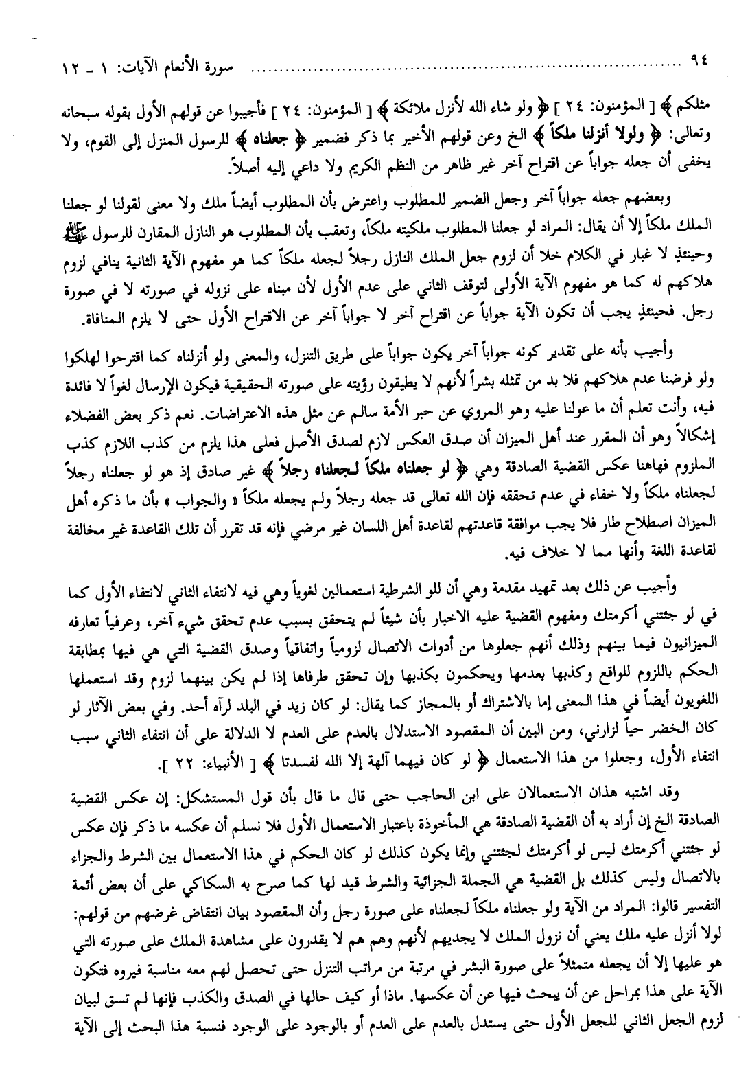 لولا أنزل عليه ملك يعني أن نزول الملك لا يجديهم لأنهم وهم هم لا يقدرون على مشاهدة الملك على صورته التي هو عليها إلا أن يجعله متمثلا على صورة البشر في مرتبة من مراتب التنزل حتى تحصل لهم معه مناسبة فيروه فتكون الآية على هذا بمراحل عن أن يبحث فيها عن أن عكسها. ماذا أو كيف حالها في الصدق والكذب فإنها لم تسق لبيان لزوم الجعل الثاني للجعل الأول حتى يستدل بالعدم على العدم أو بالوجود على الوجود فنسبة هذا البحث إلى الآية