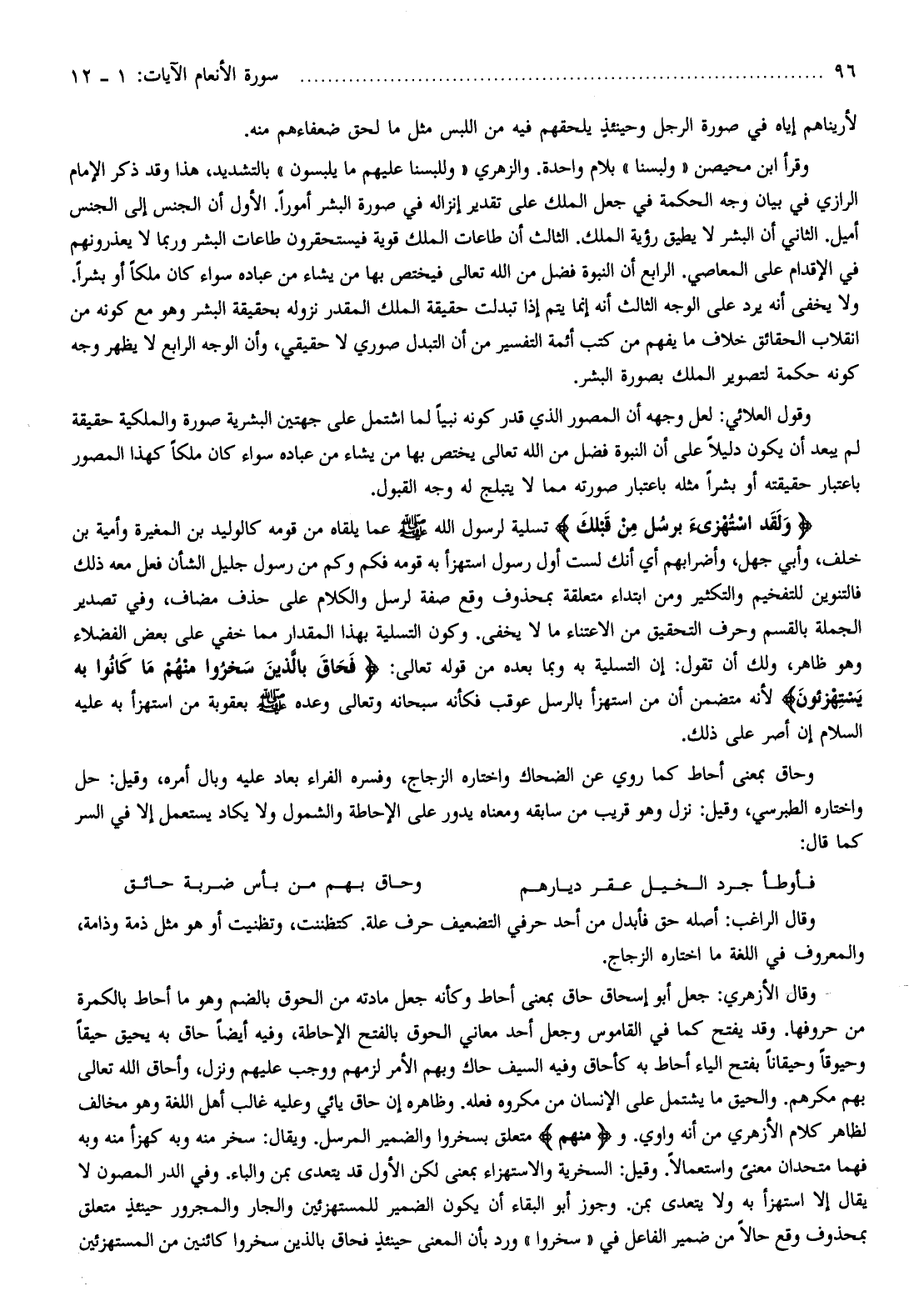 وقال الأزهري: جعل أبو إسحاق حاق بمعنى أحاط وكأنه جعل مادته من الحوق بالضم وهو ما أحاط بالكمرة من حروفها. وقد يفتح كما في القاموس وجعل أحد معاني الحوق بالفتح الإحاطة، وفيه أيضا حاق به يحيق حيقا وحيوقا وحيقانا بفتح الياء أحاط به كأحاق وفيه السيف حاك وبهم الأمر لزمهم ووجب عليهم ونزل، وأحاق الله تعالى بهم مكرهم. والحيق ما يشتمل على الإنسان من مكروه فعله. وظاهره إن حاق يائي وعليه غالب أهل اللغة وهو مخالف لظاهر كلام الأزهري من أنه واوي. ومِنْهُمْ متعلق بسخروا والضمير المرسل. ويقال: سخر منه وبه كهزأ منه وبه فهما متحدان معنى واستعمالا. وقيل: السخرية والاستهزاء بمعنى لكن الأول قد يتعدى بمن والباء. وفي الدر المصون لا يقال إلا استهزأ به ولا يتعدى بمن. وجوز أبو البقاء أن يكون الضمير للمستهزئين والجار والمجرور حينئذ متعلق بمحذوف وقع حالا من ضمير الفاعل في «سخروا» ورد بأن المعنى حينئذ فحاق بالذين سخروا كائنين من المستهزئين
