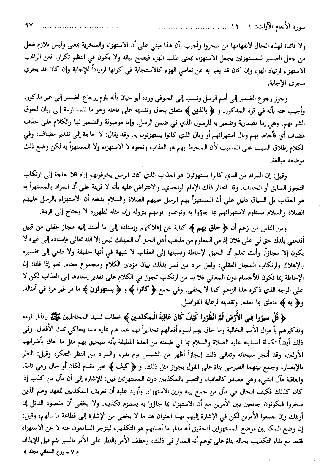 ومن الناس من زعم أن حاقَ بِهِمْ كناية عن إهلاكهم وإسناده إلى ما أسند إليه مجاز عقلي من قبيل أقدمني بلدك حق لي على فلان إذ من المعلوم من مذهب أهل الحق أن المهلك ليس إلا الله تعالى فإسناده إلى غيره لا يكون إلا مجازا. وأنت تعلم أن الحيق الإحاطة ونسبتها إلى العذاب لا شبهة في أنها حقيقة ولا داعي إلى تفسيره بالإهلاك وارتكاب المجاز العقلي، ولعل مراد من فسر بذلك بيان مؤدى الكلام ومجموع معناه. نعم إذا قلنا: إن الإحاطة إنما تكون للأجسام دون المعاني فلا بد من ارتكاب تجوز في الكلام على تقدير إسنادها إلى العذاب لكن لا على الوجه الذي ذكره هذا الزاعم كما لا يخفى. وفي جمع كانُوا ويَسْتَهْزِؤُنَ ما مر غير مرة في أمثاله.