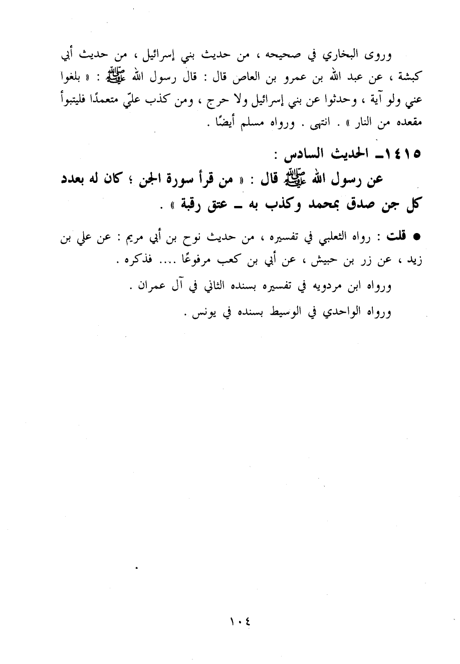 وَرَوَى البُخَارِيّ فِي صَحِيحه من حَدِيث بني إِسْرَائِيل من حَدِيث أبي كَبْشَة عَن عبد الله بن عَمْرو بن الْعَاصِ قَالَ قَالَ رَسُول الله صَلَّى اللَّهُ عَلَيْهِ وَسَلَّم َ بلغُوا عني وَلَو آيَة وَحَدثُوا عَن بني إِسْرَائِيل وَلَا حرج وَمن كذب عَلّي مُتَعَمدا فَليَتَبَوَّأ مَقْعَده من النَّار انْتَهَى وَرَوَاهُ مُسلم أَيْضا