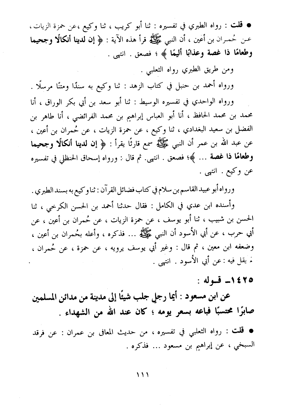 وَرَوَاهُ الواحدي فِي تَفْسِيره الْوَسِيط ثَنَا أَبُو سعد بن أبي بكر الْوراق أَنا مُحَمَّد بن مُحَمَّد الْحَافِظ أَنا أَبُو الْعَبَّاس إِبْرَاهِيم بن مُحَمَّد الْفَرَائِضِي أَنا طَاهِر بن الْفضل بن سعيد الْبَغْدَادِيّ ثَنَا وَكِيع عَن حَمْزَة الزيات عَن حمْرَان بن أعين عَن عبد الله بن عمر أَن النَّبِي صَلَّى اللَّهُ عَلَيْهِ وَسَلَّم َ سمع قَارِئًا يقْرَأ إِن لدينا أَنْكَالًا وَجَحِيمًا وَطَعَامًا ذَا غُصَّة ... فَصعِقَ انْتَهَى ثمَّ قَالَ وَرَوَاهُ إِسْحَاق الْحَنْظَلِي فِي تَفْسِيره عَن وَكِيع انْتَهَى
