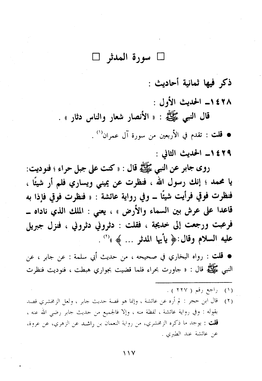 رَوَى جَابر عَن النَّبِي صَلَّى اللَّهُ عَلَيْهِ وَسَلَّم َ قَالَ كنت عَلَى جبل حراء فنوديت يَا مُحَمَّد إِنَّك رَسُول الله فَنَظَرت عَن يَمِيني ويساري فَلم أر شَيْئا فَنَظَرت فَوقِي فَرَأَيْت شَيْئا وَفِي رِوَايَة عَائِشَة فَنَظَرت فَوقِي فَإِذا بِهِ قَاعِدا عَلَى عرش بَين السَّمَاء وَالْأَرْض يَعْنِي الْملك الَّذِي ناداه فَرُعِبْت وَرجعت إِلَى خَدِيجَة فَقلت دَثرُونِي دَثرُونِي فَنزل جِبْرِيل عَلَيْهِ السَّلَام وَقَالَ يَا أَيهَا المدثر ...