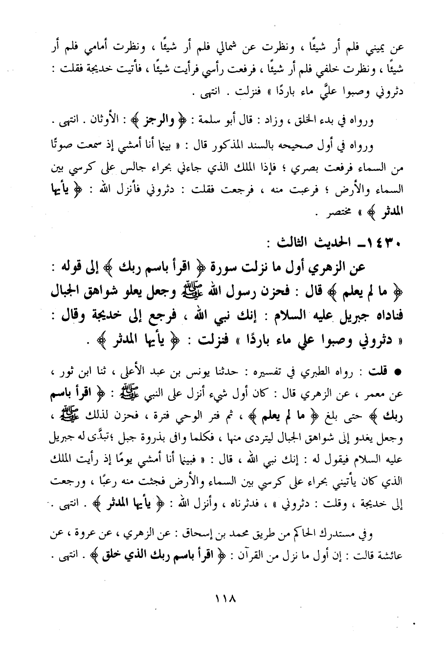 قلت رَوَاهُ الطَّبَرِيّ فِي تَفْسِيره حَدثنَا يُونُس بن عبد الْأَعْلَى ثَنَا ابْن ثَوْر عَن معمر عَن الزُّهْرِيّ قَالَ كَانَ أول شَيْء انْزِلْ عَلَى النَّبِي صَلَّى اللَّهُ عَلَيْهِ وَسَلَّم َ اقْرَأ باسم رَبك حَتَّى بلغ مَا لم يعلم ثمَّ فتر الْوَحْي فَتْرَة فَحزن لذَلِك صَلَّى اللَّهُ عَلَيْهِ وَسَلَّم َ وَجعل يَغْدُو إِلَى شَوَاهِق الْجبَال لِيَتَرَدَّى مِنْهَا فَكلما وافى بِذرْوَةِ جبل تبدى لَهُ جِبْرِيل عَلَيْهِ السَّلَام فَيَقُول لَهُ إِنَّك نَبِي الله قَالَ فَبَيْنَمَا أَنا أَمْشِي يَوْمًا إِذْ رَأَيْت الْملك الَّذِي كَانَ يأتيني بحراء عَلَى كرْسِي بَين السَّمَاء وَالْأَرْض فَجَثَتْ مِنْهُ رعْبًا وَرجعت إِلَى خَدِيجَة وَقلت دَثرُونِي فَدَثَّرْنَاهُ وَأنزل الله يأيها المدثر انْتَهَى