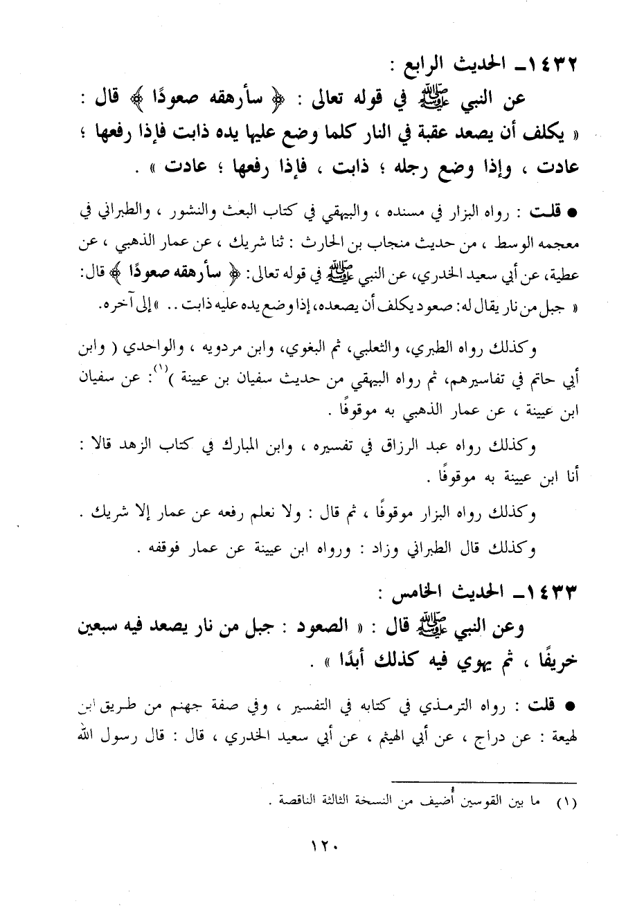 قلت رَوَاهُ الْبَزَّار فِي مُسْنده وَالْبَيْهَقِيّ فِي كتاب الْبَعْث والنشور وَالطَّبَرَانِيّ فِي مُعْجَمه الْوسط من حَدِيث منْجَاب بن الْحَارِث ثَنَا شريك عَن عمار الذَّهَبِيّ عَن عَطِيَّة عَن أبي سعيد الْخُدْرِيّ عَن النَّبِي صَلَّى اللَّهُ عَلَيْهِ وَسَلَّم َ فِي قَوْله تَعَالَى سَأُرْهِقُهُ صعُودًا قَالَ جبل من نَار يُقَال لَهُ صعُود يُكَلف أَن يَصْعَدهُ إِذا وضع يَده عَلَيْهِ ذَابَتْ ... إِلَى آخِره