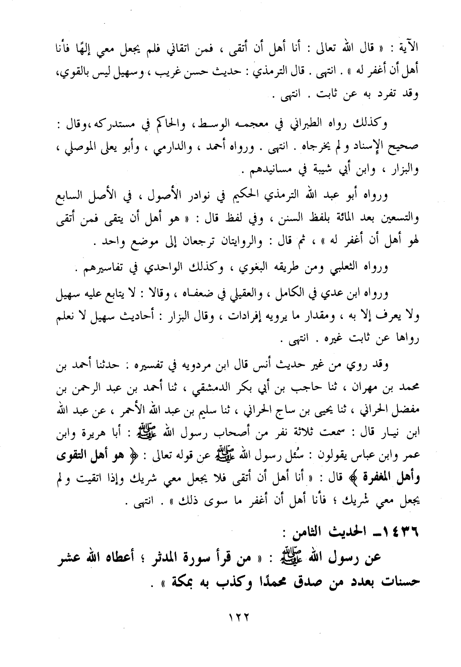 وَقد رُوِيَ من غير حَدِيث أنس قَالَ ابْن مرْدَوَيْه فِي تَفْسِيره حَدثنَا أَحْمد بن مُحَمَّد بن مهْرَان ثَنَا حَاجِب بن أبي بكر الدِّمَشْقِي ثَنَا أَحْمد بن عبد الرَّحْمَن بن مفضل الْحَرَّانِي ثَنَا يَحْيَى بن سَاج الْحَرَّانِي ثَنَا سليم بن عبد الله الْأَحْمَر عَن عبد الله ابْن نيار قَالَ سَمِعت ثَلَاثَة نفر من أَصْحَاب رَسُول الله صَلَّى اللَّهُ عَلَيْهِ وَسَلَّم َ أَبَا هُرَيْرَة وَابْن عمر وَابْن عَبَّاس يَقُولُونَ سُئِلَ رَسُول الله صَلَّى اللَّهُ عَلَيْهِ وَسَلَّم َ عَن قَوْله تَعَالَى هُوَ أهل التَّقْوَى وَأهل الْمَغْفِرَة قَالَ أَنا أهل أَن اتَّقَى فَلَا يَجْعَل معي شريك وَإِذا اتَّقَيْت وَلم يَجْعَل معي شريك فَأَنا أهل أَن أَغفر مَا سُوَى ذَلِك انْتَهَى