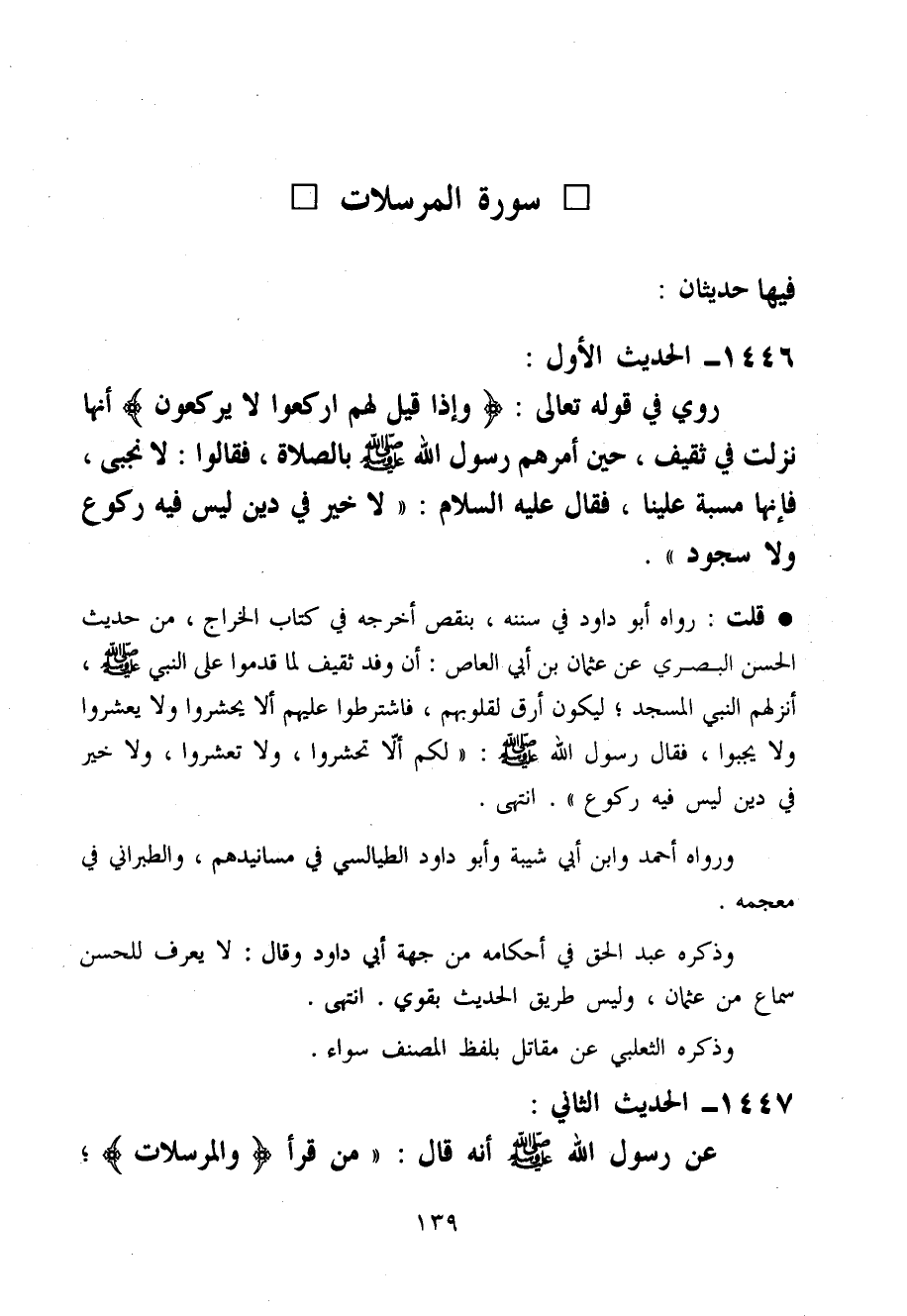 رُوِيَ فِي قَوْله تَعَالَى وَإِذا قيل لَهُم ارْكَعُوا لَا يَرْكَعُونَ أَنَّهَا نزلت فِي ثَقِيف حِين أَمرهم رَسُول الله صَلَّى اللَّهُ عَلَيْهِ وَسَلَّم َ بِالصَّلَاةِ فَقَالُوا لَا نجبى فَإِنَّهَا مسَبَّة علينا فَقَالَ عَلَيْهِ السَّلَام لَا خير فِي دين لَيْسَ فِيهِ رُكُوع وَلَا سُجُود