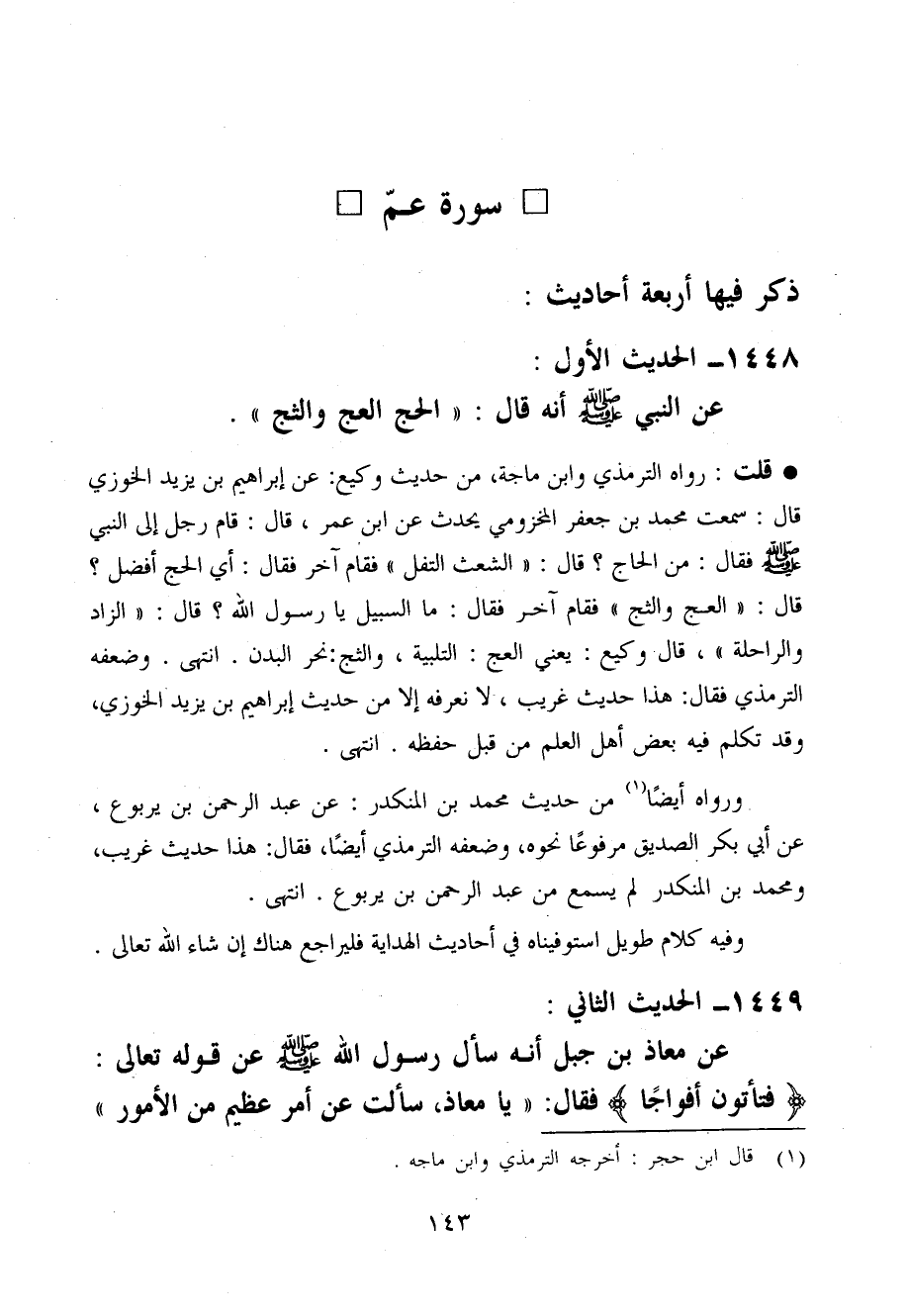 قلت رَوَاهُ التِّرْمِذِيّ وَابْن ماجة من حَدِيث وَكِيع عَن إِبْرَاهِيم بن يزِيد الخوزي قَالَ سَمِعت مُحَمَّد بن جَعْفَر المَخْزُومِي يحدث عَن ابْن عمر قَالَ قَامَ رجل إِلَى النَّبِي صَلَّى اللَّهُ عَلَيْهِ وَسَلَّم َ فَقَالَ من الْحَاج قَالَ الشعث التفل فَقَامَ آخر فَقَالَ أَي الْحَج أفضل قَالَ العج والثج فَقَامَ آخر فَقَالَ مَا السَّبِيل يَا رَسُول الله قَالَ الزَّاد وَالرَّاحِلَة قَالَ وَكِيع يَعْنِي العج التَّلْبِيَة والثج نحر الْبدن انْتَهَى وَضَعفه التِّرْمِذِيّ فَقَالَ هَذَا حَدِيث غَرِيب لَا نعرفه إِلَّا من حَدِيث إِبْرَاهِيم بن يزِيد الخوزي وَقد تكلم فِيهِ بعض أهل الْعلم من قبل حفظه انْتَهَى