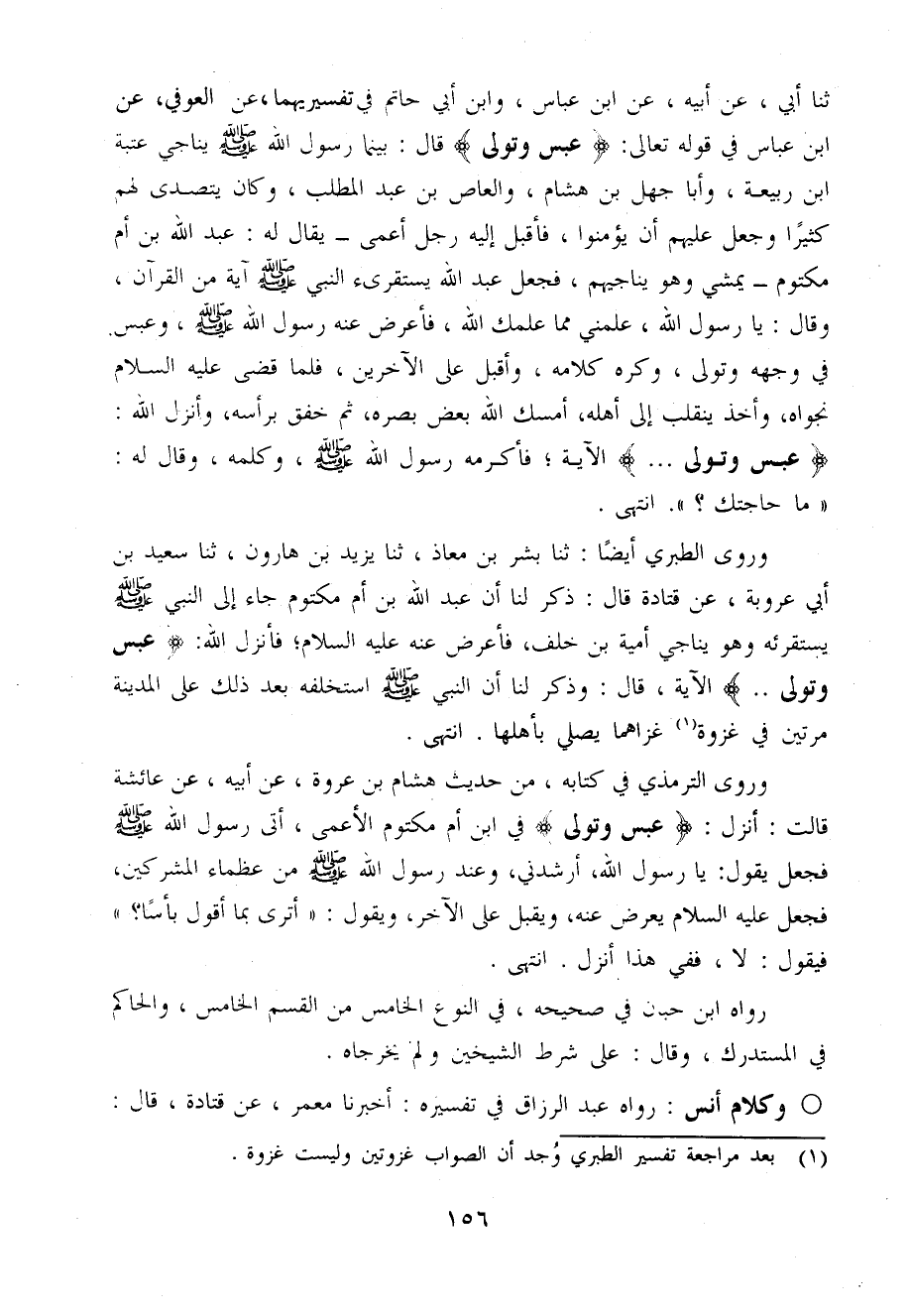ثَنَا أبي عَن أَبِيه عَن ابْن عَبَّاس وَابْن أبي حَاتِم فِي تفسريهما عَن الْعَوْفِيّ عَن ابْن عَبَّاس فِي قَوْله تَعَالَى عبس وَتَوَلَّى قَالَ بَيْنَمَا رَسُول الله صَلَّى اللَّهُ عَلَيْهِ وَسَلَّم َ يُنَاجِي عتبَة ابْن ربيعَة وَأَبا جهل بن هِشَام وَالْعَاص بن عبد الْمطلب وَكَانَ يَتَصَدَّى لَهُم كثيرا وَجعل عَلَيْهِم أَن يُؤمنُوا فَأقبل إِلَيْهِ رجل أَعْمَى يُقَال لَهُ عبد الله بن أم مَكْتُوم يمشي هُوَ يُنَاجِيهِمْ فَجعل عبد الله يَسْتَقْرِئ النَّبِي صَلَّى اللَّهُ عَلَيْهِ وَسَلَّم َ آيَة من الْقُرْآن وَقَالَ يَا رَسُول الله عَلمنِي مِمَّا علمك الله فَأَعْرض عَنهُ رَسُول الله صَلَّى اللَّهُ عَلَيْهِ وَسَلَّم َ وَعَبس فِي وَجهه وَتَوَلَّى وَكره كَلَامه وَاقْبَلْ عَلَى الآخرين فَلَمَّا قَضَى عَلَيْهِ السَّلَام نَجوَاهُ وَأخذ يَنْقَلِب إِلَى أَهله أمسك الله بعض بَصَره ثمَّ خَفق بِرَأْسِهِ وَأنزل الله عبس وَتَوَلَّى ... الْآيَة فَأكْرمه رَسُول الله صَلَّى اللَّهُ عَلَيْهِ وَسَلَّم َ وَكَلمه وَقَالَ لَهُ مَا حَاجَتك انْتَهَى