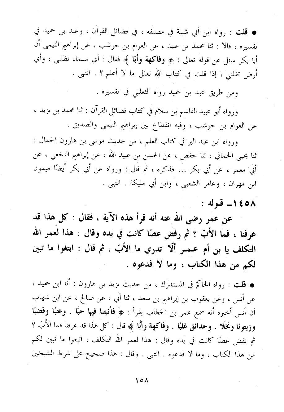 قلت رَوَاهُ الْحَاكِم فِي الْمُسْتَدْرك من حَدِيث يزِيد بن هَارُون أَنا ابْن حميد عَن أنس وَعَن يَعْقُوب بن إِبْرَاهِيم بن سعد ثَنَا أبي عَن صَالح عَن ابْن شهَاب أَن أنس أخبرهُ أَنه سمع عمر بن الْخطاب يقْرَأ فَأَنْبَتْنَا فِيهَا حبا وَعِنَبًا وَقَضْبًا وَزَيْتُونًا وَنَخْلًا وَحَدَائِق غلبا وَفَاكِهَة وَأَبا قَالَ كل هَذَا قد عرفنَا فَمَا الْأَب ثمَّ نقض عَصا كَانَت فِي يَده وَقَالَ هَذَا لعمر الله التَّكَلُّف اتبعُوا مَا تبين لكم من هَذَا الْكتاب وَمَا لَا فَدَعوهُ انْتَهَى وَقَالَ هَذَا صَحِيح عَلَى شَرط الشَّيْخَيْنِ