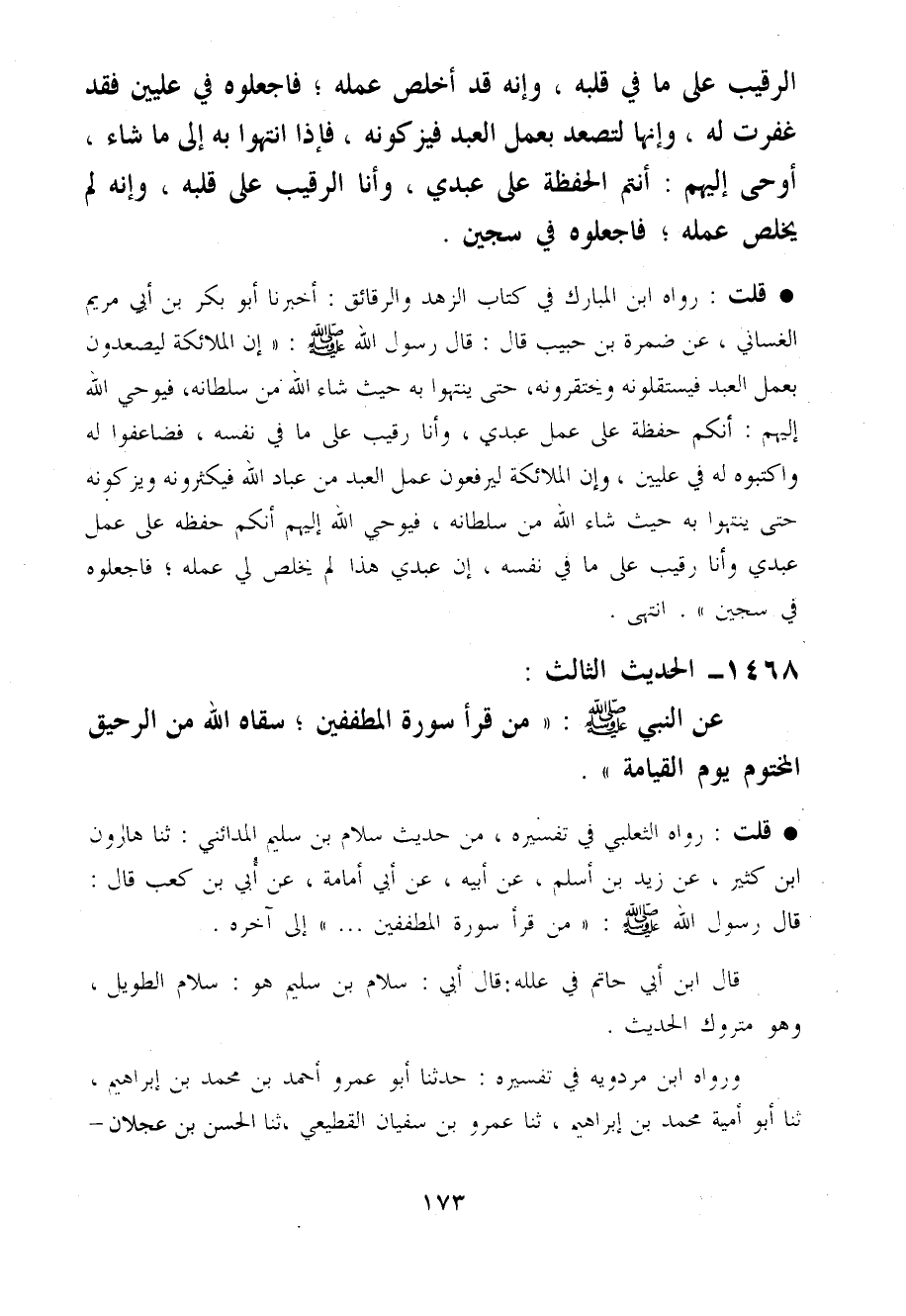 قلت رَوَاهُ ابْن الْمُبَارك فِي كتاب الزّهْد وَالرَّقَائِق أخبرنَا أَبُو بكر بن أبي مَرْيَم الغساني عَن ضَمرَة بن حبيب قَالَ قَالَ رَسُول الله صَلَّى اللَّهُ عَلَيْهِ وَسَلَّم َ إِن الْمَلَائِكَة ليصعدون بِعَمَل العَبْد فيستقلونه وَيَحْتَقِرُونَهُ حَتَّى ينْتَهوا بِهِ حَيْثُ شَاءَ الله من سُلْطَانه فَيُوحِي الله إِلَيْهِم إِنَّكُم حفظَة عَلَى عمل عَبدِي وَأَنا رَقِيب عَلَى مَا فِي نَفسه فضاعفوا لَهُ واكتبوه لَهُ فِي عليين وَإِن الْمَلَائِكَة ليرفعون عمل العَبْد من عباد الله فيكثرونه ويزكونه حَتَّى ينْتَهوا بِهِ حَيْثُ شَاءَ الله بن سُلْطَانه فَيُوحِي الله إِلَيْهِم أَنكُمْ حفظَة عَلَى عمل عَبدِي وَأَنا رَقِيب عَلَى مَا فِي نَفسه إِن عَبدِي هَذَا لم يخلص لي عمله فَاجْعَلُوهُ فِي سِجِّين انْتَهَى