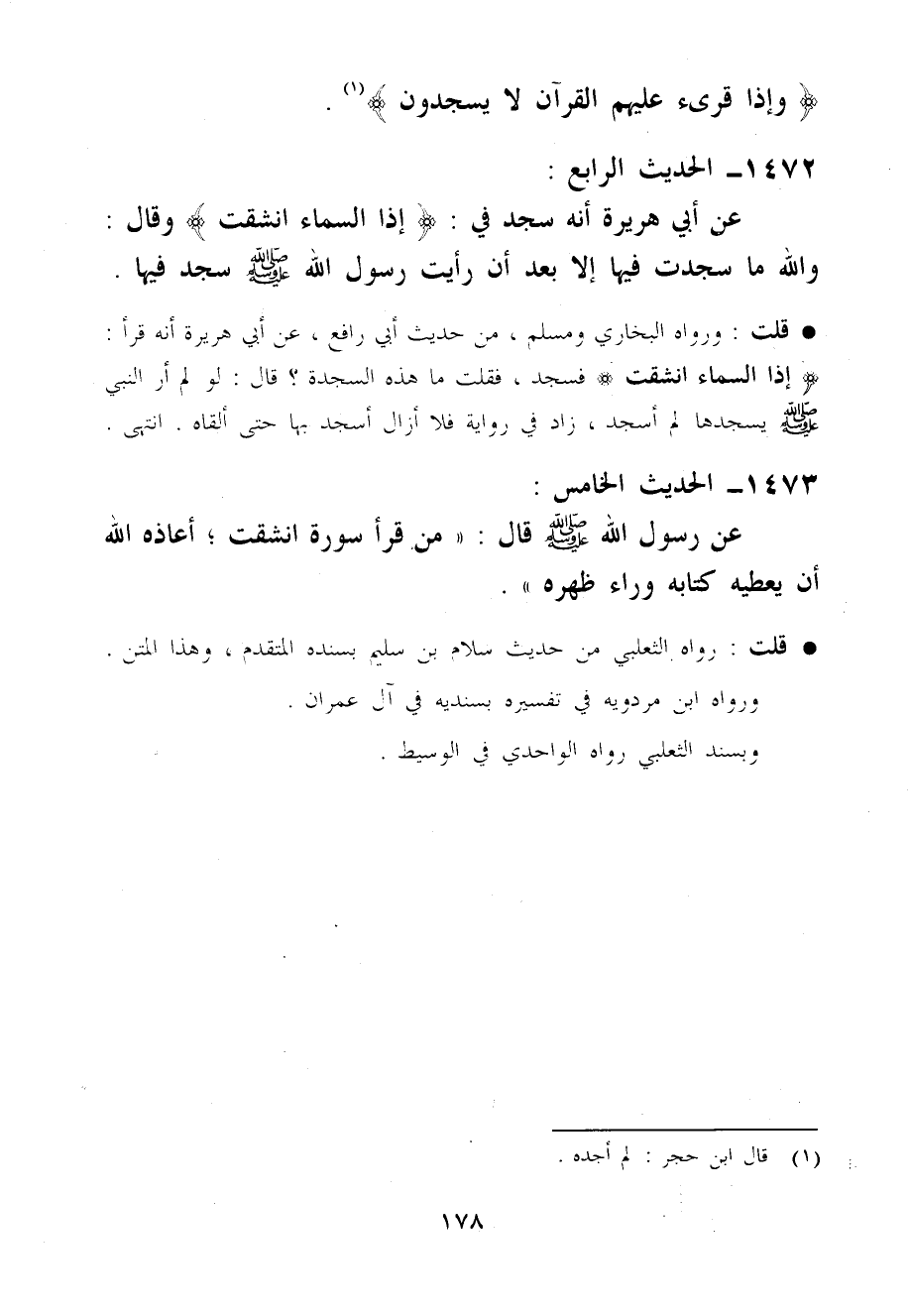قلت وَرَوَاهُ البُخَارِيّ وَمُسلم من حَدِيث أبي رَافع عَن أبي هُرَيْرَة انه قَرَأَ إِذا السَّمَاء انشقت فَسجدَ فَقلت مَا هَذِه السَّجْدَة قَالَ لَو لم أر النَّبِي صَلَّى اللَّهُ عَلَيْهِ وَسَلَّم َ يسجدها لم أَسجد زَاد فِي رِوَايَة فَلَا أَزَال أَسجد بهَا حَتَّى أَلْقَاهُ انْتَهَى