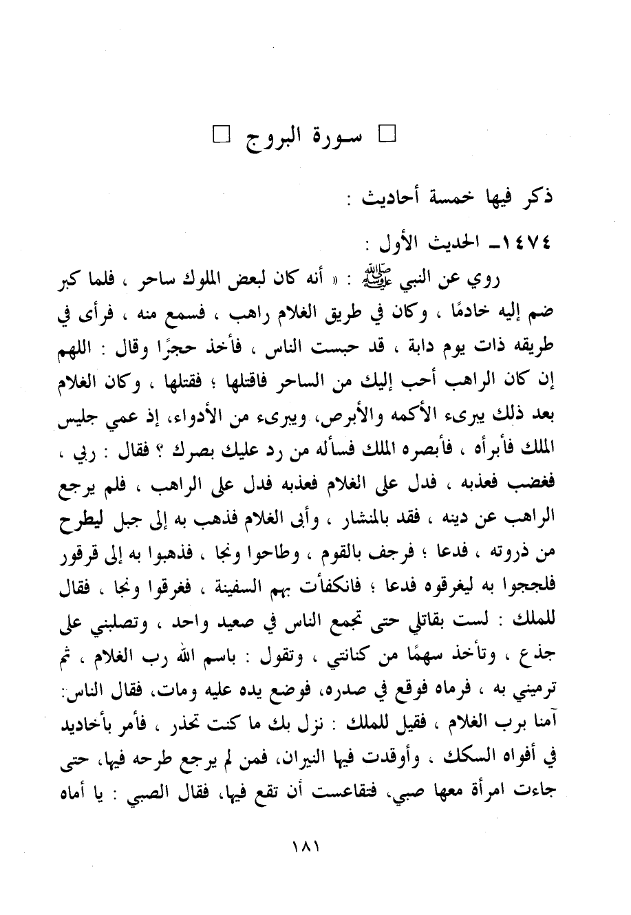 رُوِيَ عَن النَّبِي صَلَّى اللَّهُ عَلَيْهِ وَسَلَّم َ انه كَانَ لبَعض الْمُلُوك سَاحر فَلَمَّا كبر ضم إِلَيْهِ خَادِمًا وَكَانَ فِي طَرِيق الْغُلَام رَاهِب فَسمع مِنْهُ فَرَأَى فِي طَريقَة ذَات يَوْم دَابَّة قد حبست النَّاس فَأخذ حجرا وَقَالَ اللَّهُمَّ إِن كَانَ الراهب أحب إِلَيْك من السَّاحر فَاقْتُلْهَا فَقَتلهَا وَكَانَ الْغُلَام بعد ذَلِك يُبرئ الأكمه والأبرص وَيُبرئ من الأدواء إِذْ عمي جليس الْملك فَأَبْرَأهُ فَأَبْصَرَهُ الْملك فَسَأَلَهُ من رد عَلَيْك بَصرك فَقَالَ رَبِّي فَغَضب فَعَذَّبَهُ فَدلَّ عَلَى الْغُلَام فَعَذَّبَهُ فَدلَّ عَلَى الراهب فَلم يرجع الراهب عَن دينه فقد بِالْمِنْشَارِ وَأَبَى الْغُلَام فَذهب بِهِ إِلَى جبل لِيطْرَح من ذروته فَدَعَا فَرَجَفَ بالقوم وطاحوا وَنَجَا فَذَهَبُوا بِهِ إِلَى قُرْقُور فَلَججُوا بِهِ ليغرقوه فَدَعَا فَانْكَفَأت بهم السَّفِينَة فَغَرقُوا وَنَجَا فَقَالَ للْملك لست بِقَاتِلِي حَتَّى تجمع النَّاس فِي صَعِيد وَاحِد وَتَصْلُبنِي عَلَى جذع وَتَأْخُذ سَهْما من كِنَانَتِي وَتقول باسم الله رب الْغُلَام ثمَّ ترميني بِهِ فَرَمَاهُ فَوَقع فِي صَدره فَوضع يَده عَلَيْهِ وَمَات فَقَالَ النَّاس آمنا بِرَبّ الْغُلَام فَقيل للْملك نزل بك مَا كنت تحذر فَأمر بِأَخَادِيدَ فِي أَفْوَاه السكَك وَأوقدت فِيهَا النيرَان فَمن لم يرجع طَرحه فِيهَا حَتَّى جَاءَت امْرَأَة مَعهَا صبي فَتَقَاعَسَتْ أَن تقع فِيهَا فَقَالَ الصَّبِي يَا أُمَّاهُ