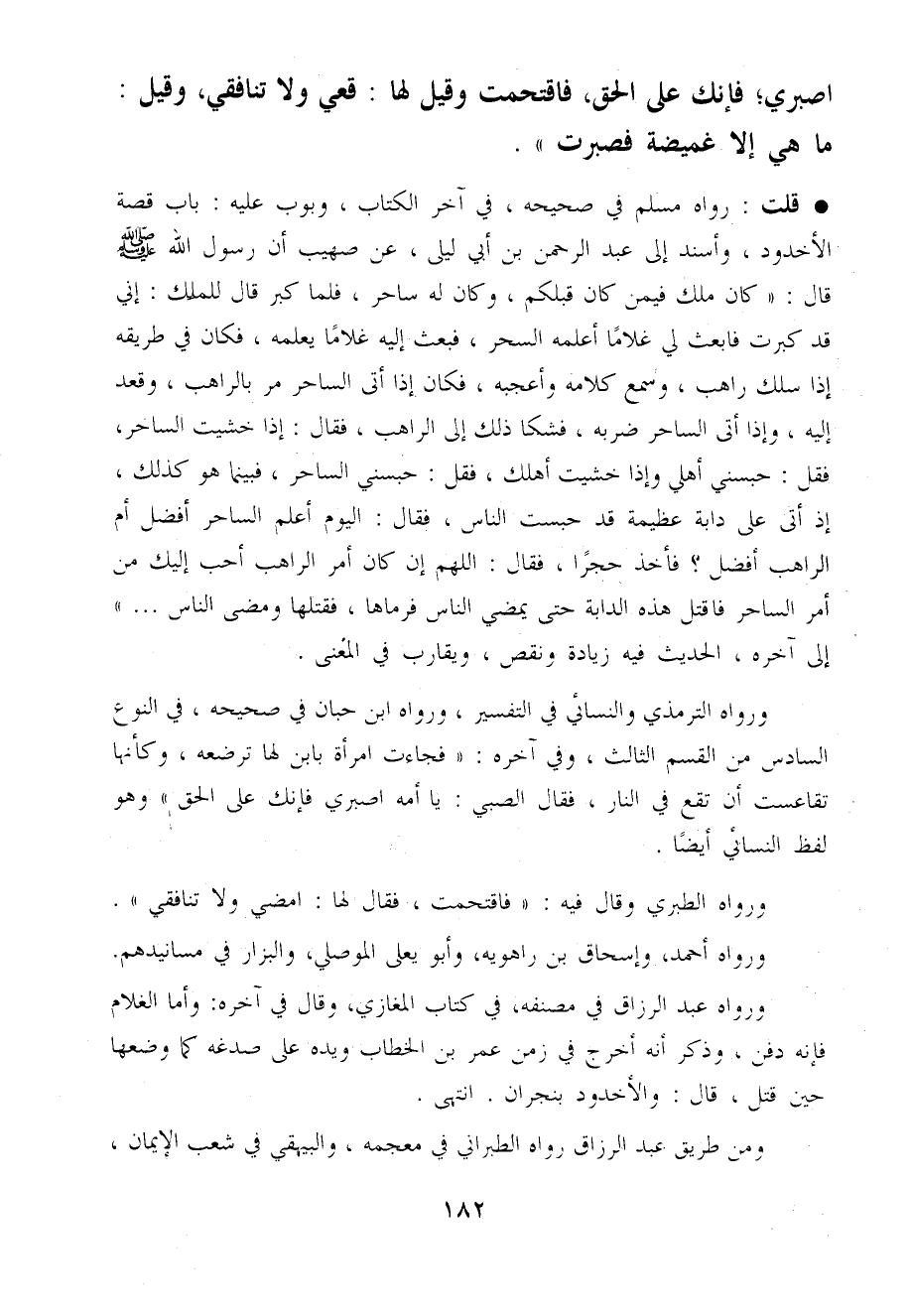 قلت رَوَاهُ مُسلم فِي صَحِيحه فِي آخر الْكتاب وَبَوَّبَ عَلَيْهِ بَاب قصَّة الْأُخْدُود وَأسْندَ إِلَى عبد الرَّحْمَن بن أبي لَيْلَى عَن صُهَيْب أَن رَسُول الله صَلَّى اللَّهُ عَلَيْهِ وَسَلَّم َ قَالَ كَانَ ملك فِيمَن كَانَ قبلكُمْ وَكَانَ لَهُ سَاحر فَلَمَّا كبر قَالَ للْملك إِنِّي قد كَبرت فَابْعَثْ لي غُلَاما أعلمهُ السحر فَبعث إِلَيْهِ غُلَاما يُعلمهُ فَكَانَ فِي طَرِيقه إِذا سلك رَاهِب وَسمع كَلَامه وَأَعْجَبهُ فَكَانَ إِذا أَتَى السَّاحر مر بِالرَّاهِبِ وَقعد إِلَيْهِ وَإِذا أَتَى السَّاحر ضربه فَشَكا ذَلِك إِلَى الراهب فَقَالَ إِذا خشيت السَّاحر فَقل حَبَسَنِي أَهلِي وَإِذا خشيت أهلك فَقل حَبَسَنِي السَّاحر فَبَيْنَمَا هُوَ كَذَلِك إِذْ أَتَى عَلَى دَابَّة عَظِيمَة قد حبست النَّاس فَقَالَ الْيَوْم أعلم السَّاحر أفضل أم الراهب أفضل فَأخذ حجرا فَقَالَ اللَّهُمَّ إِن كَانَ أَمر الراهب أحب إِلَيْك من أَمر السَّاحر فَاقْتُلْ هَذِه الدَّابَّة حَتَّى يمْضِي النَّاس فَرَمَاهَا فَقَتلهَا وَمَضَى النَّاس ... إِلَى آخِره الحَدِيث فِيهِ زِيَادَة وَنقص وَيُقَارب فِي الْمَعْنى