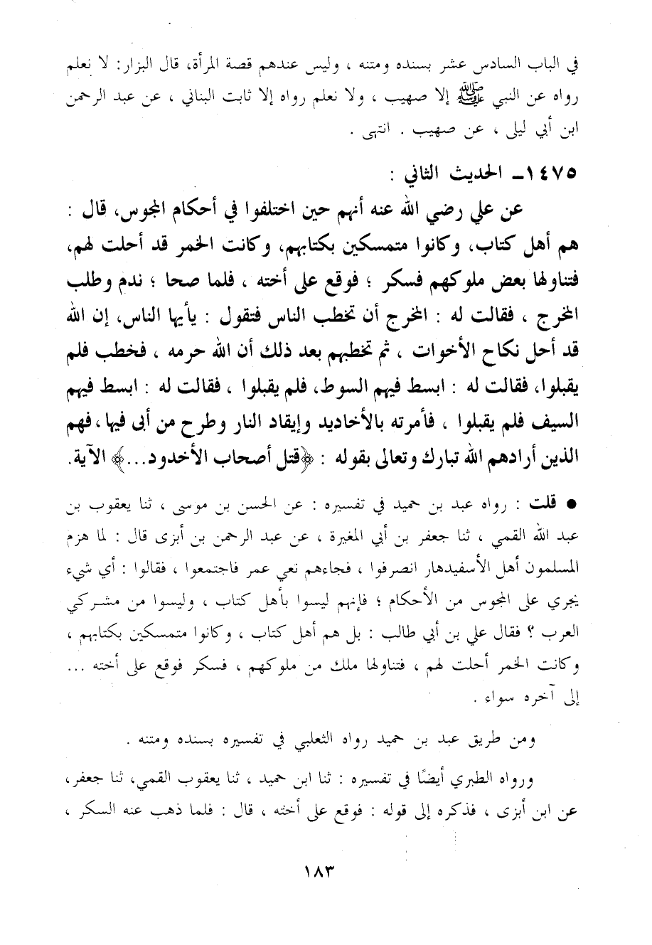 قلت رَوَاهُ عبد بن حميد فِي تَفْسِيره عَن الْحسن بن مُوسَى ثَنَا يَعْقُوب بن عبد الله القمي ثَنَا جَعْفَر بن أبي الْمُغيرَة عَن عبد الرَّحْمَن بن أَبْزَى قَالَ لما هزم الْمُسلمُونَ أهل الأسفيدهار انصرفوا فَجَاءَهُمْ نعي عمر فَاجْتمعُوا فَقَالُوا أَي شَيْء يجْرِي عَلَى الْمَجُوس من الْأَحْكَام فَإِنَّهُم لَيْسُوا بِأَهْل كتاب وَلَيْسوا من مُشْركي الْعَرَب فَقَالَ عَلّي بن أبي طَالب بل هم أهل كتاب وَكَانُوا مُتَمَسِّكِينَ بِكِتَابِهِمْ وَكَانَت الْخمر أحلّت لَهُم فَتَنَاولهَا ملك من مُلُوكهمْ فَسَكِرَ فَوَقع عَلَى أُخْته ... إِلَى آخِره سَوَاء