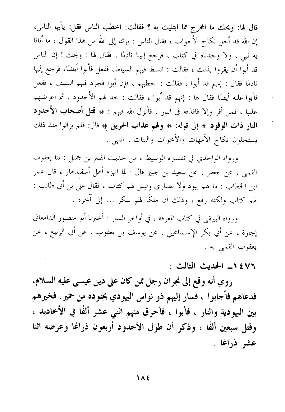 رُوِيَ أَنه وَقع إِلَى نَجْرَان رجل مِمَّن كَانَ عَلَى دين عِيسَى عَلَيْهِ السَّلَام فَدَعَاهُمْ فَأَجَابُوا فَسَار إِلَيْهِم ذُو نواس الْيَهُودِيّ بجُنُوده من حمير فَخَيرهمْ بَين الْيَهُودِيَّة وَالنَّار فَأَبَوا فَأحرق مِنْهُم اثْنَي عشر ألفا فِي الأخاديد وَقتل سبعين ألفا وَذكر أَن طول الْأُخْدُود أَرْبَعُونَ ذِرَاعا وَعرضه اثْنَا عشر ذِرَاعا