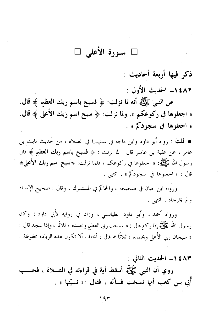 عَن النَّبِي صَلَّى اللَّهُ عَلَيْهِ وَسَلَّم َ أَنه لما نزلت فسبح باسم رَبك الْعَظِيم قَالَ اجْعَلُوهَا فِي ركوعكم وَلما نزلت سبح اسْم رَبك الْأَعْلَى قَالَ اجْعَلُوهَا فِي سُجُودكُمْ