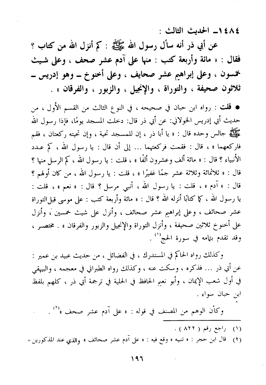 عَن أبي ذَر أَنه سَأَلَ رَسُول الله صَلَّى اللَّهُ عَلَيْهِ وَسَلَّم َ كم أنزل الله من كتاب فَقَالَ مائَة وَأَرْبَعَة كتب مِنْهَا عَلَى آدم عشر صحف وَعَلَى شِيث خَمْسُونَ وَعَلَى إِبْرَاهِيم عشر صحايف وَعَلَى أَخْنُوخ وَهُوَ إِدْرِيس ثَلَاثُونَ صحيفَة والتوراة وَالْإِنْجِيل وَالزَّبُور وَالْفرْقَان