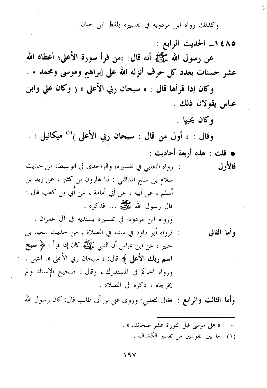 عَن رَسُول الله صَلَّى اللَّهُ عَلَيْهِ وَسَلَّم َ أَنه قَالَ من قَرَأَ سُورَة الْأَعْلَى أعطَاهُ الله عشر حَسَنَات بِعَدَد كل حرف انزله الله عَلَى إِبْرَاهِيم ومُوسَى وَمُحَمّد