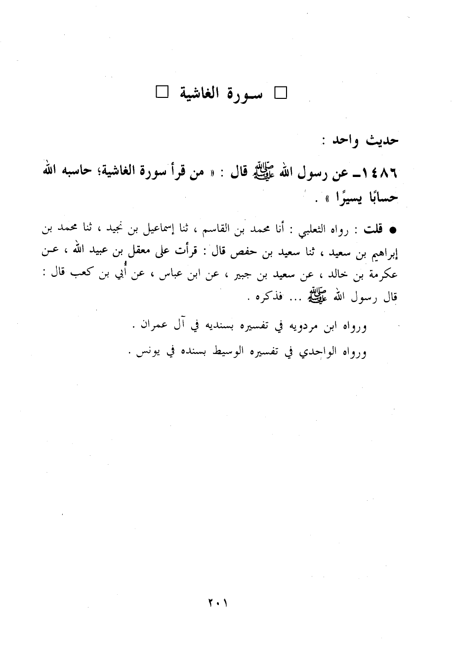 1486 - عَن رَسُول الله صَلَّى اللَّهُ عَلَيْهِ وَسَلَّم َ قَالَ من قَرَأَ سُورَة الغاشية حَاسبه الله حسابا يَسِيرا