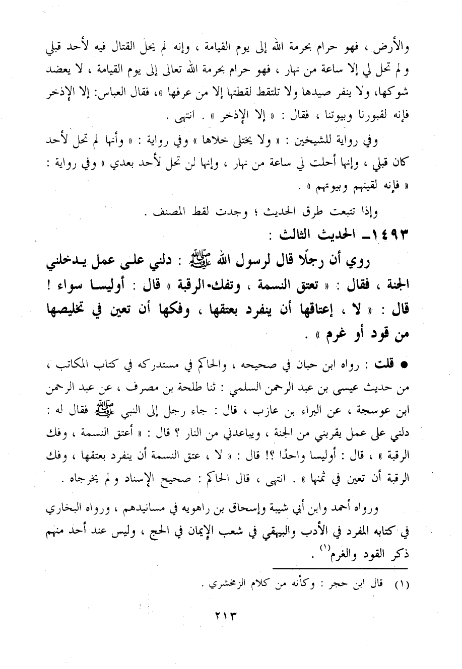 قلت رَوَاهُ ابْن حبَان فِي صَحِيحه وَالْحَاكِم فِي مُسْتَدْركه فِي كتاب الْمكَاتب من حَدِيث عِيسَى بن عبد الرَّحْمَن السّلمِيّ ثَنَا طَلْحَة بن مصرف عَن عبد الرَّحْمَن ابْن عَوْسَجَة عَن الْبَراء بن عَازِب قَالَ جَاءَ رجل إِلَى النَّبِي صَلَّى اللَّهُ عَلَيْهِ وَسَلَّم َ فَقَالَ لَهُ دلَّنِي عَلَى عمل يقربنِي من الْجنَّة وَيُبَاعِدنِي من النَّار قَالَ اعْتِقْ النَّسمَة وَفك الرَّقَبَة قَالَ أوليسا وَاحِدًا قَالَ لَا عتق النَّسمَة أَن ينْفَرد بِعتْقِهَا وَفك الرَّقَبَة أَن تعين فِي ثمنهَا انْتَهَى قَالَ الْحَاكِم صَحِيح الْإِسْنَاد وَلم يخرجَاهُ