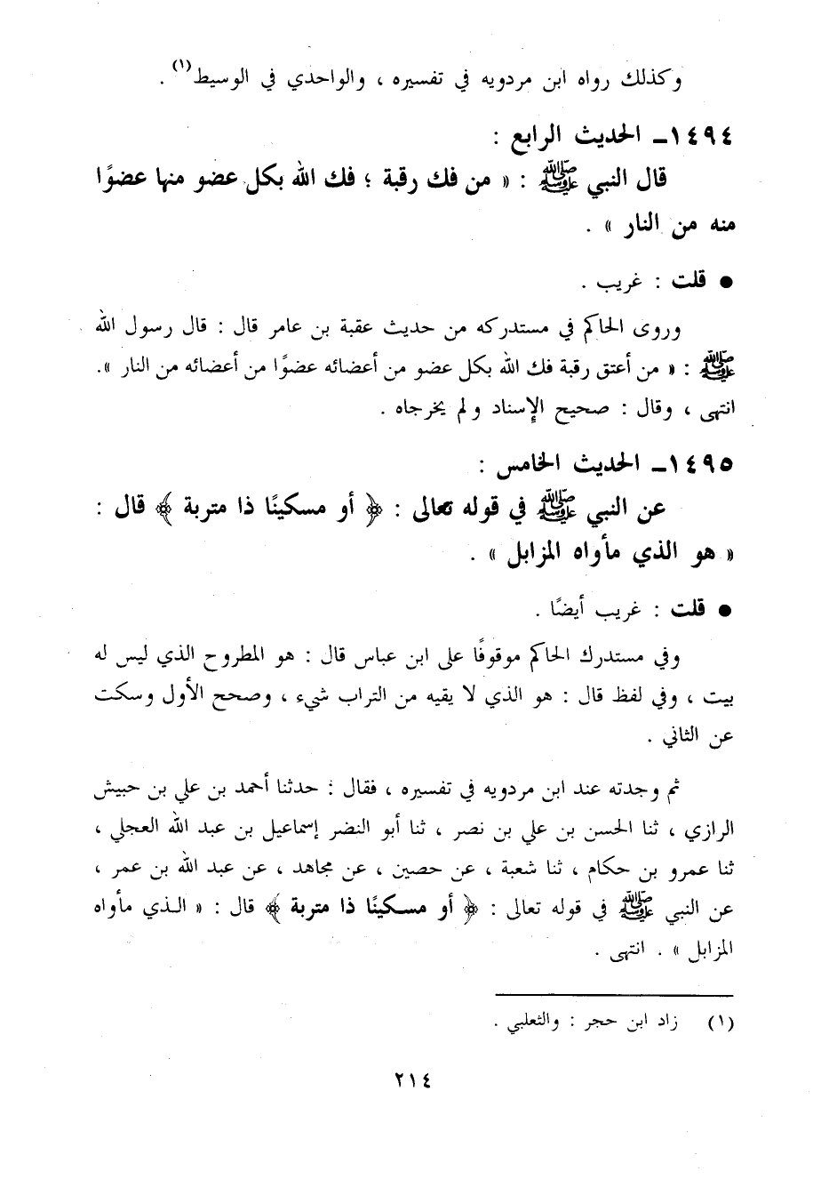قَالَ النَّبِي صَلَّى اللَّهُ عَلَيْهِ وَسَلَّم َ من فك رَقَبَة فك الله بِكُل عُضْو مِنْهَا عضوا مِنْهُ من النَّار