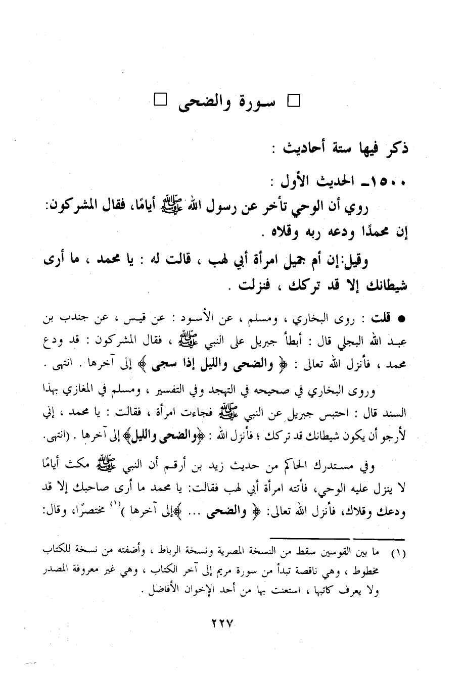 قلت رَوَى البُخَارِيّ وَمُسلم عَن الْأسود عَن قيس عَن جُنْدُب بن عبد الله البَجلِيّ قَالَ أَبْطَا جِبْرِيل عَلَى النَّبِي صَلَّى اللَّهُ عَلَيْهِ وَسَلَّم َ فَقَالَ الْمُشْركُونَ قد ودع مُحَمَّد فَأنْزل الله تَعَالَى وَالضُّحَى وَاللَّيْل إِذا سَجى إِلَى آخرهَا انْتَهَى