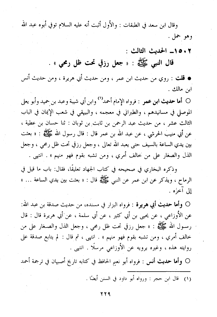 أما حَدِيث ابْن عمر فَرَوَاهُ الإِمَام احْمَد وَابْن أبي شيبَة وَعبد بن حميد وَأَبُو يعْلى الْموصِلِي فِي مسانيدهم وَالطَّبَرَانِيّ فِي مُعْجَمه وَالْبَيْهَقِيّ فِي شعب الْإِيمَان فِي الْبَاب الثَّالِث عشر من حَدِيث عبد الرَّحْمَن بن ثَابت بن ثَوْبَان ثَنَا حسان بن عَطِيَّة عَن أبي منيب الْحَرَشِي عَن عبد الله بن عمر قَالَ قَالَ رَسُول الله صَلَّى اللَّهُ عَلَيْهِ وَسَلَّم َ بعثت بَين يَدي السَّاعَة بِالسَّيْفِ حَتَّى يعبد الله تَعَالَى وَجعل رِزْقِي تَحت ظلّ رُمْحِي وَجعل الذل وَالصغَار عَلَى من خَالف أَمْرِي وَمن تشبه بِقوم فَهُوَ مِنْهُم انْتَهَى