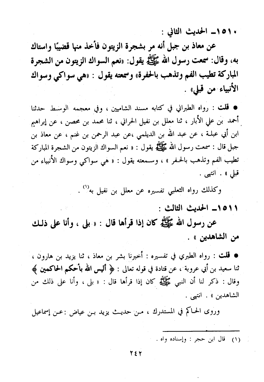 قلت رَوَاهُ الطَّبَرَانِيّ فِي كِتَابه مُسْند الشاميين وَفِي مُعْجَمه الْوسط حَدثنَا أَحْمد بن عَلّي الْأَبَّار ثَنَا مُعَلل بن نفَيْل الْحَرَّانِي ثَنَا مُحَمَّد بن مُحصن عَن إِبْرَاهِيم ابْن أبي عبلة عَن عبد الله بن الديلمي عَن عبد الرَّحْمَن بن غنم عَن معَاذ بن جبل قَالَ سَمِعت رَسُول الله صَلَّى اللَّهُ عَلَيْهِ وَسَلَّم َ يَقُول نعم السِّوَاك الزَّيْتُون من الشَّجَرَة الْمُبَارَكَة تطيب الْفَم وَتذهب بِالْحفرِ وسمعته يَقُول هِيَ سِوَاكِي وَسوَاك الْأَنْبِيَاء من قبلي انْتَهَى