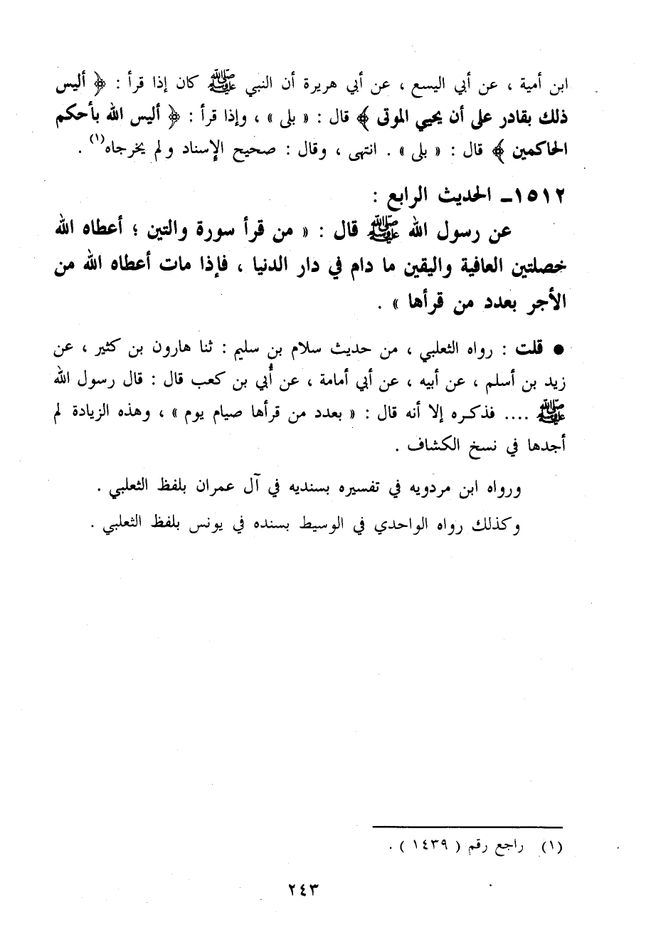 ابْن أُميَّة عَن أبي اليسع عَن أبي هُرَيْرَة أَن النَّبِي صَلَّى اللَّهُ عَلَيْهِ وَسَلَّم َ كَانَ إِذا قَرَأَ أَلَيْسَ ذَلِك بِقَادِر عَلَى أَن يحيي الْمَوْتَى قَالَ بلَى وَإِذا قَرَأَ أَلَيْسَ الله بِأَحْكَم الْحَاكِمين قَالَ بلَى انْتَهَى وَقَالَ صَحِيح الْإِسْنَاد وَلم يخرجَاهُ